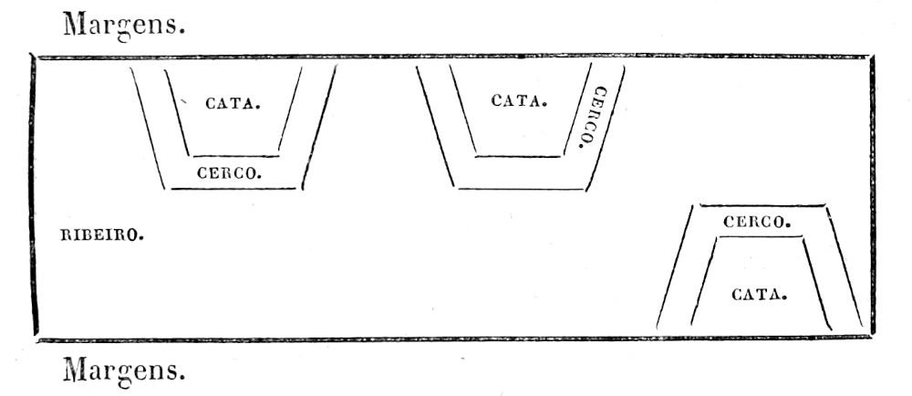 Até aqui o que toca ás lavras da terra junto da agua; porém as dos ribeiros, se elles são capazes de se lhes poder desviar a agua, divertindo esta por huma banda do mesmo ribeiro, com cerco feito de páos mui direitos, deitados huns sobre outros com estacas bem amarradas, feito em forma de cano por huma e outra parte, para que se possa entupir de terra por dentro, do modo que aqui se vê.