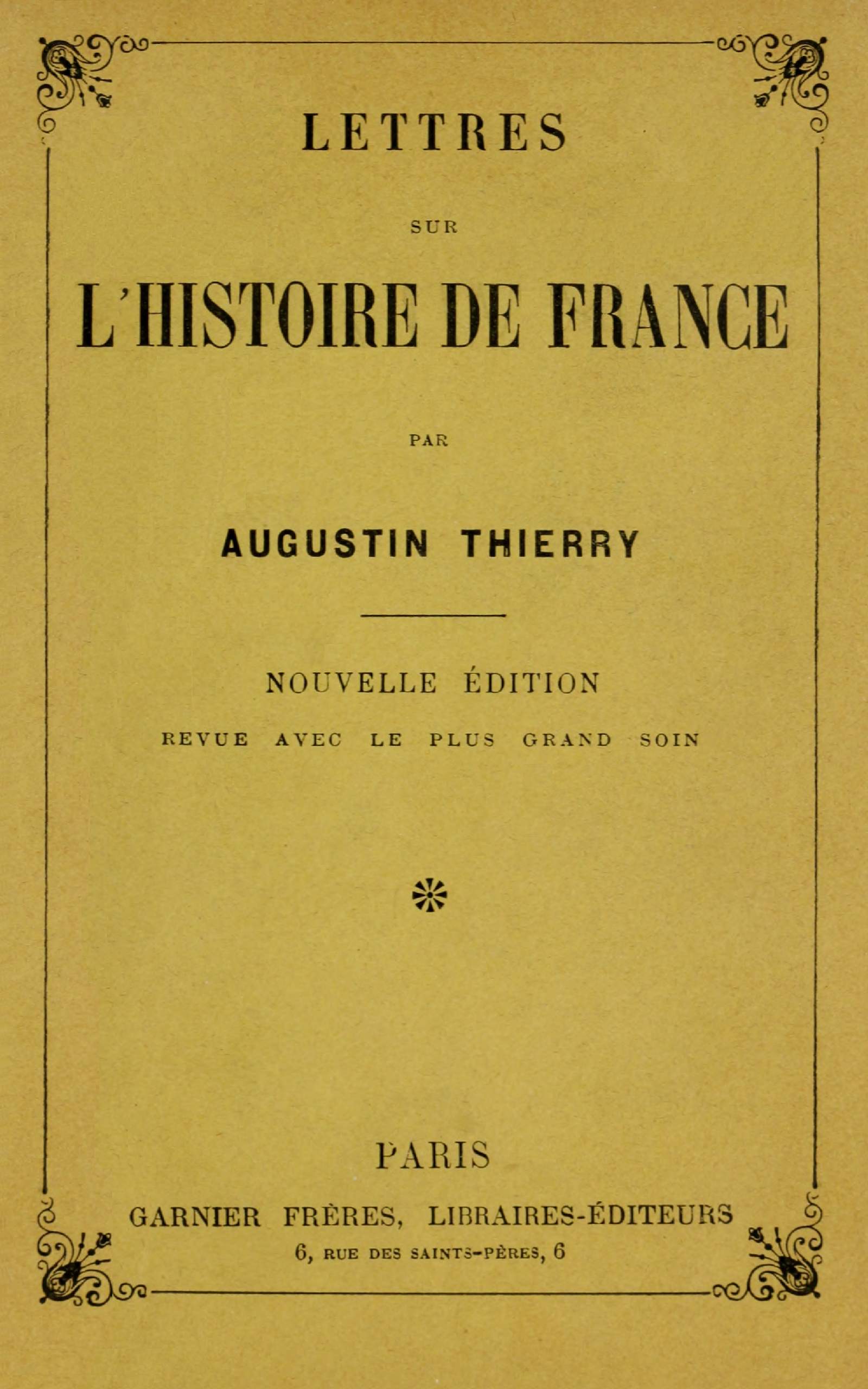 Des vingt-cinq Lettres qui forment ce recueil, dix ont été publiées dans le Courrier français, vers la fin de 1820 ; les autres paraissent pour la première fois. Les nombreuses questions historiques traitées dans ces dernières se rapportent toutes, d’une manière directe, à deux chefs principaux : la formation de la nation française, et la révolution communale. J’ai cherché à déterminer le point précis où l’histoire de France succède à l’histoire des rois franks[1], et à marquer de ses véritables traits le plus grand mouvement social qui ait eu lieu depuis l’établissement du christianisme jusqu’à la révolution française. Quant aux dix Lettres anciennement publiées, elles ont, en général, pour objet de soumettre à un examen sévère plusieurs ouvrages sur l’histoire de France regardés alors comme classiques. J’ai besoin d’exposer en peu de mots les motifs qui m’ont décidé à reproduire presque textuellement ces morceaux de critique, malgré l’espèce d’anachronisme que présentent des jugements portés il y a sept ans sur notre manière d’écrire et d’envisager l’histoire.
