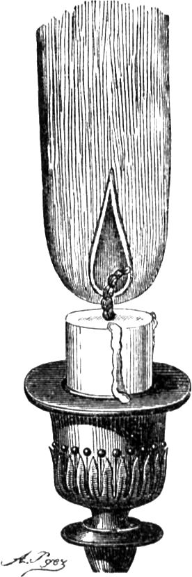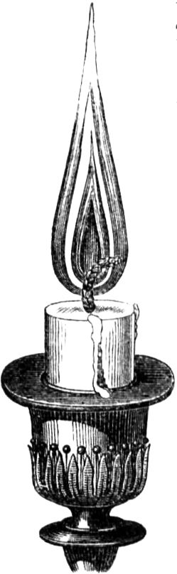 Eine Dame, welche diese Vorträge mit ihrer Gegenwart beehrt, hat mich noch weiter durch Übersendung dieser beiden Kerzen zu Dank verpflichtet. Sie stammen aus Japan und sind vermutlich aus jenem Material verfertigt, das ich Euch schon in der ersten Vorlesung zeigte, dem sogenannten Japanischen Wachs. Ihr seht, sie sind noch viel zierlicher gestaltet und ausgeschmückt als jene französischen Kerzen, die ich ebenfalls damals vorwies, und ihrem ganzen äußeren Aussehen nach möchte man sie wahre Luxuskerzen nennen. Außerdem aber zeigen sie eine merkwürdige Eigentümlichkeit, nämlich einen hohlen Docht – jene vorzügliche Verbesserung[164] also, welche Argand an der Lampe einführte und durch welche er ihren Wert so bedeutend erhöhte. Wer schon öfter Sendungen aus dem fernen Osten erhielt, wird wohl bemerkt haben, daß solche Gegenstände auf dem langen Transport ein mattes, unscheinbares Aussehen bekommen haben; es ist aber ganz leicht, ihnen die ursprüngliche Schönheit und das frische Äußere wiederzugeben; man braucht sie zu diesem Zweck nur mit einem reinen seidenen Tuch gut abzureiben, also die Unebenheiten und Rauhigkeiten ihrer Oberfläche gleichsam zu polieren. Eine dieser beiden Kerzen habe ich so behandelt und Ihr werdet den Unterschied von der andern nicht polierten bemerken, die ich natürlich ebenso auffrischen könnte. Außerdem ist an diesen japanischen Kerzen noch die Eigentümlichkeit hervorzuheben, daß sie viel mehr kegelförmig gegossen sind, als es bei uns üblich ist.