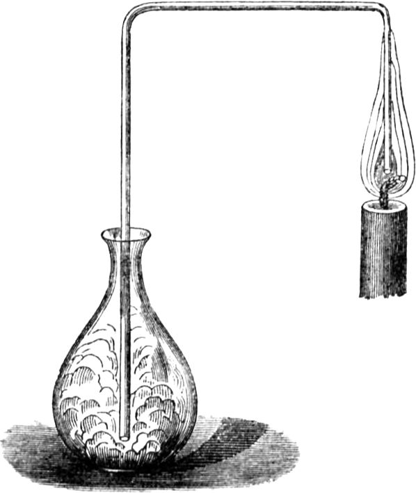 Wir gelangen nunmehr zu einem anderen und zwar sehr wichtigen Teil unseres Thema. Erinnern wir uns, was wir bereits an unserer brennenden Kerze erforscht haben. Wir sahen, daß sie beim Brennen verschiedene Stoffe entstehen läßt, und fanden Kohle in Gestalt von Ruß[19], Wasser und etwas anderes, was wir noch nicht untersucht haben. Das Wasser fingen wir auf, die übrigen Verbrennungsprodukte ließen wir bisher ungehindert in die Luft entweichen. Diese nun müssen wir jetzt unserer Forschung unterwerfen.