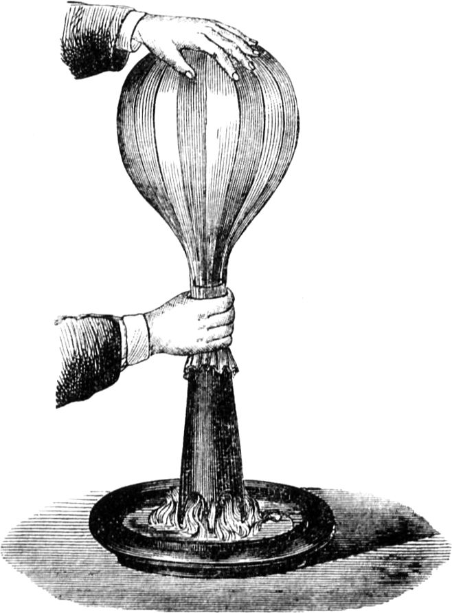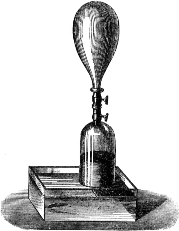 Doch genug für jetzt von dem Druck und dem Gewichte der Luft, um noch eine andere wichtige Eigenschaft an ihr kennen zu lernen. Ihr saht soeben bei der Knallbüchse, wie ich den zweiten Pfropfen ½ bis ¾ Zoll weit hineintreiben konnte, ehe der vordere hinausflog, daß also die eingeschlossene Luft bis zu einem gewissen Punkte dem Druck nachgab; ebenso[151] saht Ihr, wie sich die Luft in der kupfernen Flasche mittelst der Pumpe so bedeutend zusammenpressen ließ. Nun, das hängt von einer wunderbaren Eigenschaft der Luft ab, nämlich von ihrer Elastizität. Ich werde Euch diese Eigenschaft der Luft möglichst gut zu veranschaulichen suchen. Eine Blase aus Gummihaut, wie ich sie hier habe, eignet sich vortrefflich dazu. Sie ist luftdicht, d. h. sie läßt weder Luft ein- noch austreten; aber sie kann sich ausdehnen und wieder zusammenziehen, so daß sie der darin eingeschlossenen Luft in jeder Weise nachgibt, und daher gleichsam als Maßstab ihrer Elastizität dienen kann. Ihr seht, die jetzt schlaffe Blase enthält nur wenig Luft. Ich binde sie fest zu, bringe sie unter die Glocke der Luftpumpe und pumpe aus dieser die Luft heraus, hebe also den Druck der letzteren auf die in der Blase befindliche Luft auf. Seht, wie sie jetzt fort und fort sich ausdehnt, weiter und immer weiter, bis sie nun den ganzen Innenraum der Glocke ausgefüllt hat. Und lasse ich nun die Luft wieder in die Glasglocke eindringen, seht da, so geht auch die Luft in der Blase wieder auf ihren ursprünglichen Umfang zurück. Dies zeigt uns deutlich die wunderbare Eigenschaft der Luft, welche man Elastizität nennt. Vermöge derselben ist sie in so hohem Grade befähigt, sich zusammendrücken zu lassen und sich auszudehnen, und gerade hierdurch ist sie ganz besonders zu ihrer wichtigen Rolle im Haushalte der Natur geeignet.