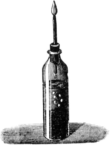 Ihr erinnert Euch, daß eine schlecht brennende Kerze Ruß entwickelt, während bei einer gut brennenden davon nichts zu sehen ist; Ihr wißt aber auch, daß die Helligkeit der Kerzenflamme gerade diesem Ruße zu verdanken ist, welcher zunächst ins Glühen kommt und schließlich verbrennt. Hier habe ich ein Experiment vorbereitet, an dem es sich recht deutlich zeigt, wie hellleuchtend die Flamme wird, wenn alle Kohlenteilchen innerhalb derselben zum Erglühen und Verbrennen gelangen, so daß dabei durchaus nichts von schwarzen Flöckchen zu sehen ist. Ich entzünde einen ungemein lebhaft brennenden Stoff, Terpentinöl nämlich, mit dem dieser Schwamm getränkt ist. Seht den aufsteigenden Ruß, wie er massenhaft in der Luft herumfliegt! Und nun denkt daran, daß ich Euch sagte: von solchem Ruß, solcher Kohle, entsteht die Kohlensäure, wie wir sie aus der Kerze erhielten. Das nun will ich Euch jetzt beweisen. Ich bringe den Schwamm mit dem brennenden Terpentinöl in ein Glas voll Sauerstoff, und da seht Ihr denn, wie prächtig jetzt die Flamme[166] leuchtet und daß aller Ruß vollständig verzehrt wird. Dies ist aber erst die eine Hälfte unseres Experiments. Was folgt nun?