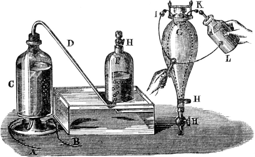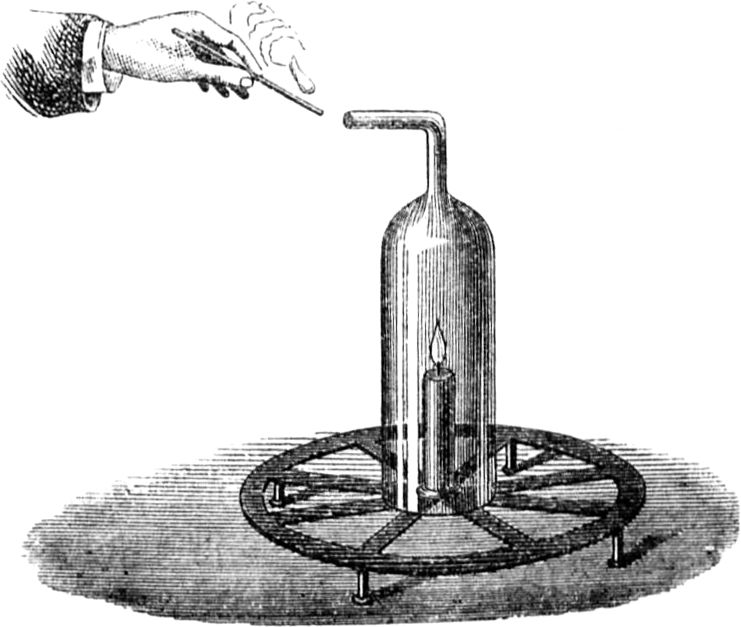 Wie wir bei Untersuchung der Verbrennungsprodukte unserer Kerze bereits das aufgefundene Wasser in seine Elemente zerlegten, so müssen wir jetzt auch die aus der Kerze entwickelte Kohlensäure auf ihre Bestandteile prüfen, und einige Experimente werden uns auch hier zum Ziele führen.