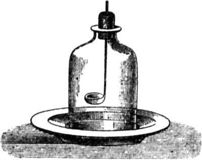 Jetzt werde ich Euch noch ein anderes Experiment zeigen, um Euch diesen wichtigen Teil unserer Untersuchung möglichst vollständig zu erläutern. Hier ist eine Glasglocke, die nichts als Luft enthält, was Ihr daran sehen könnt, daß meine Kerze oder die Gasflamme darin gleichmäßig fortbrennt. Ich verschließe sie mit einem Stöpsel und mittelst einer Glasröhre im Kork bringe ich meinen Mund so darüber, daß ich die darin enthaltene Luft einatmen kann. Wenn ich die Glocke auf Wasser setze, wie Ihr es hier seht, so bin ich imstande, die Luft herauszuziehen (natürlich muß der Kork ganz luftdicht schließen), sie in meine Lungen gelangen zu lassen und sie dann zurück in das Gefäß auszuatmen. Nun können wir sie untersuchen, um den Erfolg zu erfahren. Daß ich die Luft zuerst aussog und sie dann zurückatmete, konntet Ihr deutlich an dem Auf- und Niedersteigen des Wassers beobachten. Ich bringe nun einen brennenden Wachsstock in diese ausgeatmete Luft, und ihr werdet ihren Zustand an dem Verlöschen der Flamme erkennen. Ein einziger Atemzug hat diese Luft, wie Ihr seht, vollständig verdorben, so daß es ganz nutzlos sein würde, sie nochmals einatmen zu wollen. Nun begreift Ihr auch den Grund der Unzweckmäßigkeit vieler Einrichtungen in den Häusern besonders der ärmeren Klassen, welche es bedingen, daß dieselbe Luft immer und immer wieder eingeatmet werden muß, weil der Mangel geeigneter Ventilation die Zufuhr frischer Luft[181] erschwert. Wenn schon ein einziger Atemzug die Luft so verdirbt, wie Ihr es hier gesehen, wie wesentlich muß da für unsere Gesundheit frische Luft sein!