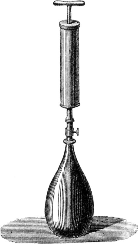 Ich habe schon mehrmals die Frage von Euch gehört und mich gefreut, daß Ihr sie tatet: »Wie wägt man Gase?« Ich will es Euch zeigen. Es ist ganz einfach und leicht. Hier habe ich eine Wage und hier eine kupferne Flasche; diese ist so dünn und leicht als möglich gemacht, doch so, daß sie noch fest und stark ist, zugleich vollkommen luftdicht und auf der Drehbank sauber abgedreht. Sie ist mit einem Hahn versehen, den man leicht schließen und öffnen kann; jetzt steht er offen, läßt also die Luft frei in die Flasche eintreten. Hier nun habe ich meine feine, sehr empfindliche Wage, und ich denke, die Flasche in ihrem gegenwärtigen Zustande wird gerade von dem Gewicht gehalten werden, das auf der anderen Schale liegt. Ferner habe ich hier eine Pumpe, mittelst welcher wir Luft in die kupferne Flasche pressen können, und zwar wollen wir eine gewisse Anzahl von Raumteilen Luft hineinpressen, denen der Stiefel der Pumpe als Maß dient. Wir wollen jetzt gleich zwanzig solcher Raumteile[142] in die Flasche hineinpumpen. – So! – Nun schließen wir den Hahn fest und bringen die Flasche auf die Wage. Seht, wie sie sinkt! Sie ist jetzt bedeutend schwerer geworden. Wodurch? Nun, durch die Luft, die wir mit der Pumpe hineingepreßt haben. Es ist nichts als Luft darin, die Luft darin nimmt auch keinen größeren Raum ein, aber wir haben schwerere Luft in demselben Raum, weil wir eben die Luft zusammengepreßt haben. Damit Ihr nun auch erfahrt, wieviel dem Raum nach die eingepreßte Luft beträgt, habe ich hier eine Flasche voll Wasser, deren Hals genau in den der Kupferflasche paßt und[143] ebenfalls mit einem Hahn versehen ist. Ich schraube sie beide sorgfältig aufeinander und öffne die Hähne, so daß nun die durch 20 Pumpenzüge komprimierte Luft in die Glasflasche übertreten und sich ungehindert zu ihrem ursprünglichen Umfang wieder ausdehnen kann. Um nun sicher zu sein, daß wir bei unsrer Arbeit ganz richtig zu Werke gegangen sind, wollen wir die kupferne Flasche wieder auf die Wage legen; wird sie von dem Gewicht auf der andern Schale – es ist noch dasselbe wie vorhin – auch jetzt wieder genau im Gleichgewicht gehalten, so war unser Experiment richtig. Seht, die Wage steht ganz gleich. Auf diese Weise also können wir das Gewicht der Luftmenge ermitteln, die wir mittelst der Pumpe hineinpressen und daraus dann das Gewicht eines Kubikmeter Luft zu 1293 Gramm bestimmen. Doch kann solch ein Experiment im kleinen Euch unmöglich die ganze Bedeutung dieses Gegenstandes vor Augen führen. Es ist wahrhaft wunderbar, wie viel auffälliger sie wird, wenn man solche Versuche mit größeren Luftmengen ausführt. Dieses Volumen Luft hier – das ist ein Liter – wiegt nicht ganz 11/3 Gramm. Wie hoch schätzt Ihr den Inhalt des Kastens dort, den ich eigens zu diesem Zweck habe machen lassen? Die Luft darin wiegt gerade ein Pfund, ein volles Pfund. Auch das Gewicht der Luft in diesem Saale habe ich berechnet; sie wiegt – Ihr werdet’s kaum denken – aber sie wiegt wirklich über eine Tonne (d. i. 1000 Kilogramm).[144] Seht, so ungeheuer wachsen da gleich die Zahlen an, und von solcher Bedeutung ist die Gegenwart der atmosphärischen Luft und des Sauerstoffs und Stickstoffs in ihr, woraus wir wiederum auf die Größe des Nutzens schließen können, den sie uns schafft, indem sie Stoffe hin und her, von einem Ort zum andern versetzt und schädliche Dünste dahin bringt, wo sie nützlich wirken statt zu schaden.