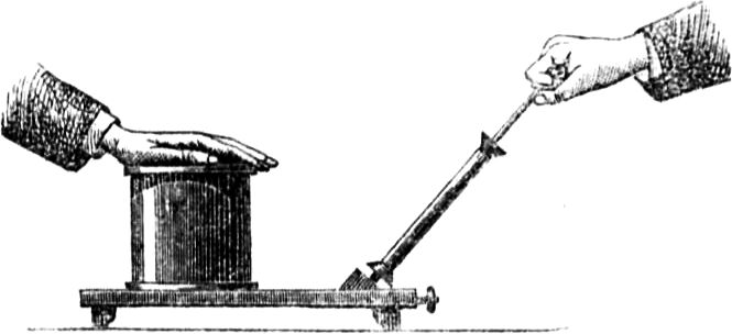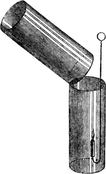 Ich hoffe, das Ihr durch alles dieses eine richtige Vorstellung von dem Gewichte, also auch von der Körperlichkeit[149] der Luft bekommen habt, und wenn ich Euch sage, daß der Kasten dort ein Pfund Luft enthält und dieses Zimmer mehr als eine Tonne, so wird es Euch wohl begreiflich sein, daß die Luft ein ganz gewichtiger Körper ist. Ich will noch ein anderes Experiment zeigen, um Euch ihre Widerstandsfähigkeit darzutun. Die Knallbüchse kennt wohl jeder, die man so leicht aus einem Federkiel oder irgend einer ähnlichen Röhre herstellen kann; aus einem Kartoffel- oder Apfelscheibchen wird mit dem Kiel selbst ein Pfropfen ausgestochen und an das andere Ende hingeschoben, wie ich es hier mache, so daß der Ausgang dicht verschlossen wird; nun steche ich ein zweites Stückchen aus und schiebe es hinein; jetzt ist also die Luft im Innern der Röhre vollständig eingeschlossen, ganz wie wir’s zu unserm Zweck gebrauchen. Nun aber zeigt es sich, daß keine Kraft imstande ist, dieses zweite Pfröpfchen vollständig auf das erste aufzutreiben; das ist eine völlige Unmöglichkeit. Bis zu einem gewissen Grad läßt sich die Luft wohl zusammenpressen, doch lange vor der Berührung der beiden Pfropfen wird die eingezwängte Luft den vorderen Pfropfen mit einem Knall hinaustreiben; die Wirkung ist hier ähnlich wie beim Schießpulver, dessen Kraft zum Teil von denselben Umständen abhängig ist, welche Ihr hier erläutert seht.