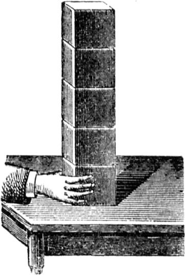 Ich will noch ein anderes Experiment machen, welches Euch darüber noch besser Aufklärung geben wird. Über diesen Zylinder ist eine Schweinsblase ausgespannt und festgebunden; ich bringe den Zylinder auf die Luftpumpe und pumpe die Luft heraus – Ihr werdet gleich den Erfolg sehen, jetzt ist die Blase flach ausgespannt; setze ich aber die Pumpe ein wenig in Bewegung – seht, wie sie einsinkt, wie sie nach unten eingedrückt wird; seht, wie sie tiefer und immer tiefer niederwärts geht, bis sie vermutlich zuletzt durch die Gewalt der darauf drückenden Luft zersprengt werden wird. [Die Blase zerspringt zuletzt mit einem lauten Knall.] Das geschah einzig und allein durch die darauf drückende Last der darüber stehenden Luft, und dieser Hergang ist ganz leicht zu verstehen. Die Luftschichten können wir uns[146] übereinander aufgestapelt denken, wie die fünf Würfel hier auf einander stehen. Nun seht Ihr doch, daß die vier oberen von diesen Würfeln von dem fünften, der auf dem Boden aufliegt, getragen werden, und wenn ich diesen wegnehme, so müssen die oberen heruntersinken. Gerade so ist’s auch bei der atmosphärischen Luft. Die oberen Luftschichten werden von den untersten getragen, ruhen auf ihr, und wenn diese untere Luftschicht weggepumpt wird, so müssen eben Wirkungen eintreten, wie Ihr sie an meiner auf den Recipienten gefesselten Hand und am Zersprengen der Blase gesehen habt, und wie Ihr sie jetzt noch besser beobachten sollt. Über dieses Gefäß hier habe ich eine Gummihaut gespannt und werde nun die Luft herauspumpen. An diesem Gummi, der also eine Scheidewand zwischen der untern Luftschicht und der obern bildet, könnt Ihr den Druck sehr deutlich beobachten. Jetzt kann ich schon die ganze Hand in das Gefäß hineinlegen. Und dieses Resultat wird einzig bewirkt durch den gewaltigen Druck der oberen Luftschichten. Wie schön zeigen sich da diese wunderbaren Verhältnisse!