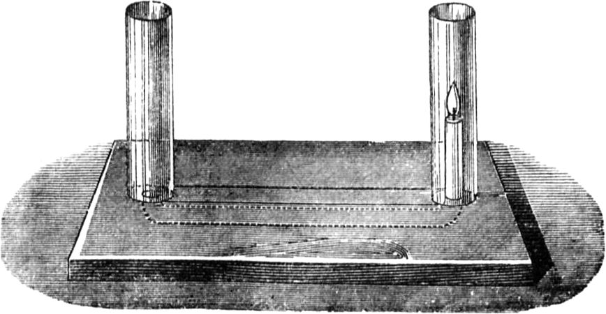 Ich habe mir dazu einen kleinen Apparat ersonnen, den ich gleich vor Euch aufbauen werde. Hier ist ein[178] Brettchen, in das eine Rinne eingeschnitten ist, und diese Rinne kann ich von oben mit einer etwas kürzeren Platte zudecken, so daß auf jeder Seite eine Mündung frei bleibt; den so entstandenen Kanal kann ich ferner durch aufgesetzte Glasröhren an jeder Mündung aufwärts leiten, so daß das Ganze einen freien Durchgang bietet. Wenn ich nun einen Wachsstock oder eine Kerze (wir dürfen jetzt frei im Gebrauch des Wortes »Kerze« sein, seitdem wir seine ganze Bedeutung verstehen) in eine von den Röhren stelle, so wird die Verbrennung sehr gut vonstatten gehen. Ihr merkt, daß die Luft, welche die Flamme unterhält, in der Röhre auf der linken Seite hinabsteigt, dann durch die horizontale Rinne geht und in der Röhre am andern Ende, in der die Kerze brennt, aufsteigt. Wenn ich die Öffnung, durch welche die Luft eintritt, verstopfe, so hemme ich alsbald die Verbrennung, wie Ihr begreift. Ich schneide die Luftzufuhr ab, und die Kerze geht aus. Aber was können wir nun weiter daran knüpfen? In einem früheren Experimente[23] zeigte ich Euch, was geschieht, wenn die Luft von einer brennenden Kerze zu einer anderen gelangt. Würde ich nun hier Luft, die von einer anderen Kerze kommt, durch eine geeignete Vorrichtung in diese Röhre einleiten, so wißt Ihr, daß dieses Licht verlöschen müßte. Indes, was werdet Ihr sagen, wenn ich behaupte, daß auch mein Atem die[179] Kerze zum Verlöschen bringt? Ich meine nicht etwa durch Ausblasen, sondern einfach: die Natur meines Atmens ist derart, daß die Kerze darin nicht zu brennen vermag. Ich werde jetzt meinen Mund über die Öffnung halten und, ohne daß ich die Flamme im geringsten anblase, keine andere Luft in die Röhre gelangen lassen, als die aus meinem Munde kommt. Da seht Ihr schon das Ergebnis. Ich habe die Kerze durchaus nicht ausgeblasen; ich ließ nur die Luft, die ich ausatmete, in die Mündung des Kanals eintreten, und das Licht auf der andern Seite verlöschte aus keinem andern Grunde als aus Mangel an Sauerstoff. Etwas anderes – nämlich meine Lunge – hatte den Sauerstoff aus der Luft fortgenommen, und so war keiner mehr da, die Verbrennung der Kerze zu unterhalten. Ich halte es für recht interessant, zu beobachten, wieviel Zeit die schlechte Luft gebraucht, die ich auf dieser Seite in den Kanal hineinatme, bis sie auf der andern Seite zur Kerze gelangt; anfangs brennt diese noch ganz ruhig weiter, sobald aber die ausgeatmete Luft sie erreicht, löscht sie aus.