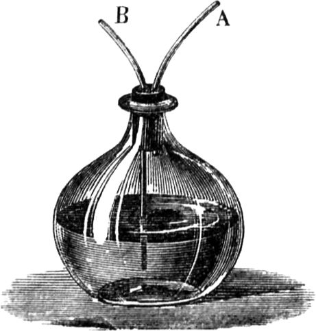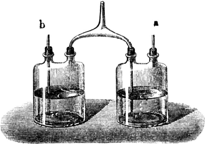 Ich habe hier zwei Flaschen, welche beide mit Kalkwasser gefüllt und durch Röhren verbunden sind, wie Ihr’s hier seht. Der Apparat ist zwar nur roh, wird aber doch für unsern Zweck genügen. Wenn ich nun an diesen Flaschen hier (bei a) ein- und dort[183] (bei b) ausatme, so bewirkt die Einrichtung der Röhren, daß die Luft in beiden Fällen durch das Kalkwasser streicht. Zunächst bemerkt man nun, daß die gute Luft beim Einatmen in dem Kalkwasser wiederum gar keine Veränderung hervorbringt; und alsdann seht ihr die Wirkung beim Ausatmen: das Kalkwasser wird getrübt; und es ist doch nichts als mein Atem damit in Berührung gekommen. Der Unterschied ist wohl auffallend genug!