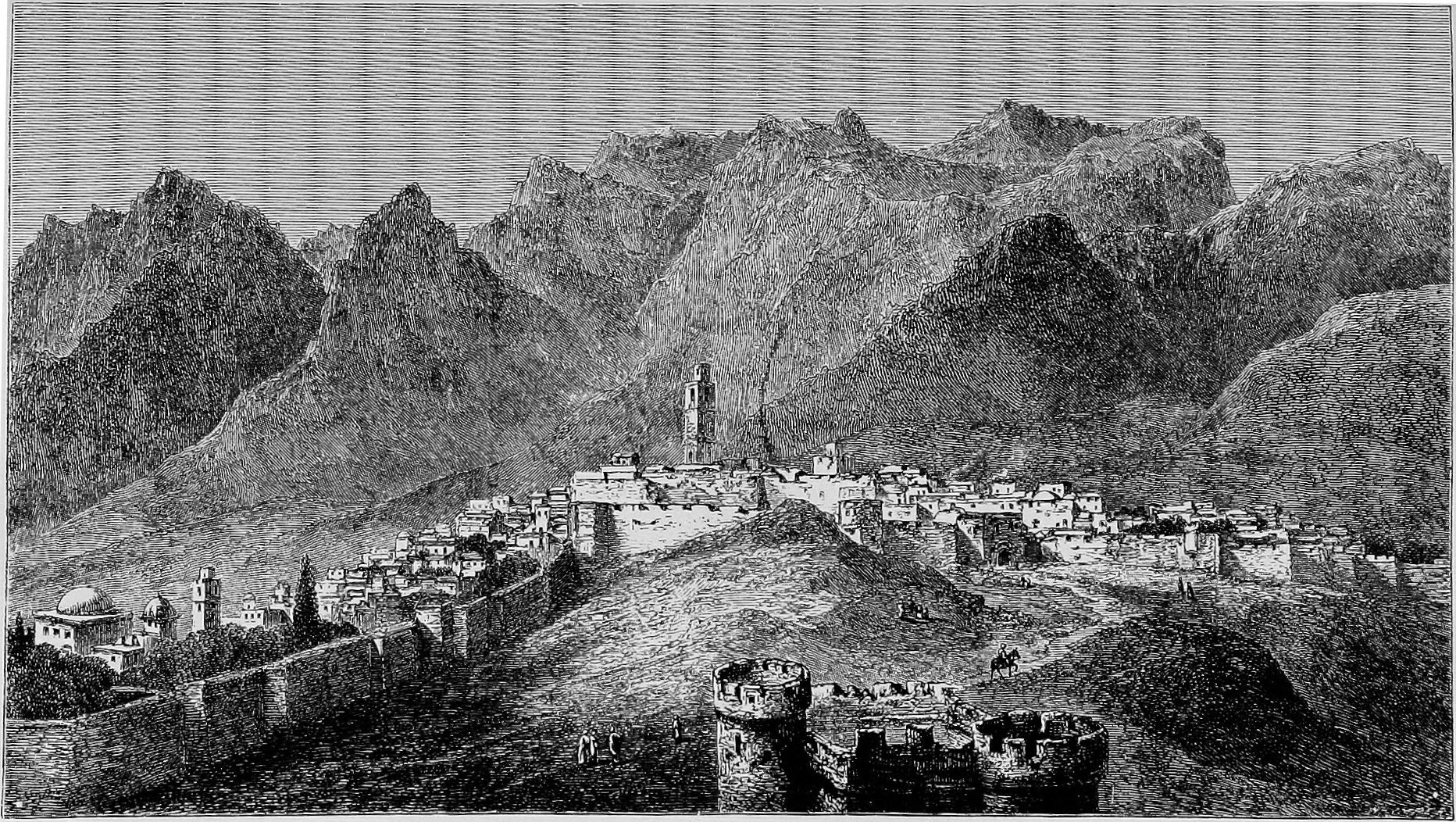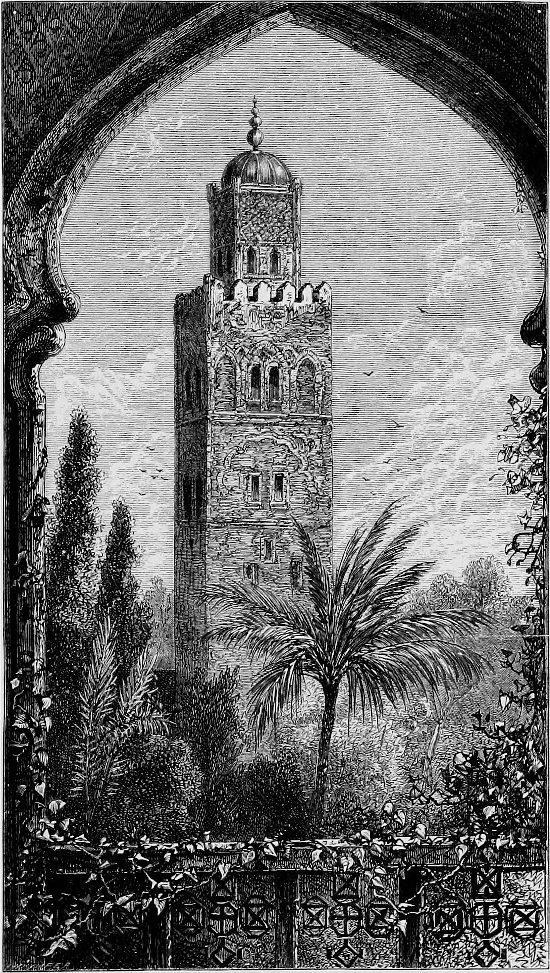 | Departure from Mogador — Argan forest — Hilly country of Haha — Fertile province of Shedma — Hospitality of the Governor — Turkish visitor — Offering of provisions — Kasbah of the Governor — Ride to Aïn Oumast — First view of the Great Atlas — Pseudo-Sahara — Tomb of a saint — Nzelas — Ascend the ‘Camel’s Back’ — Oasis of Sheshaoua — Coolness of the night temperature — Rarity of ancient buildings — Halt at Aïn Beida — Tents and luggage gone astray — Night at Misra ben Kara — Cross the Oued Nfys — Plain of Marocco — Range of the Great Atlas — Halt under tamarisk tree | 95 |