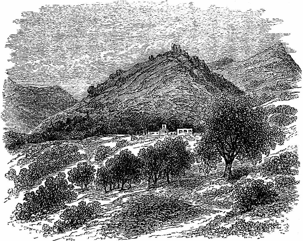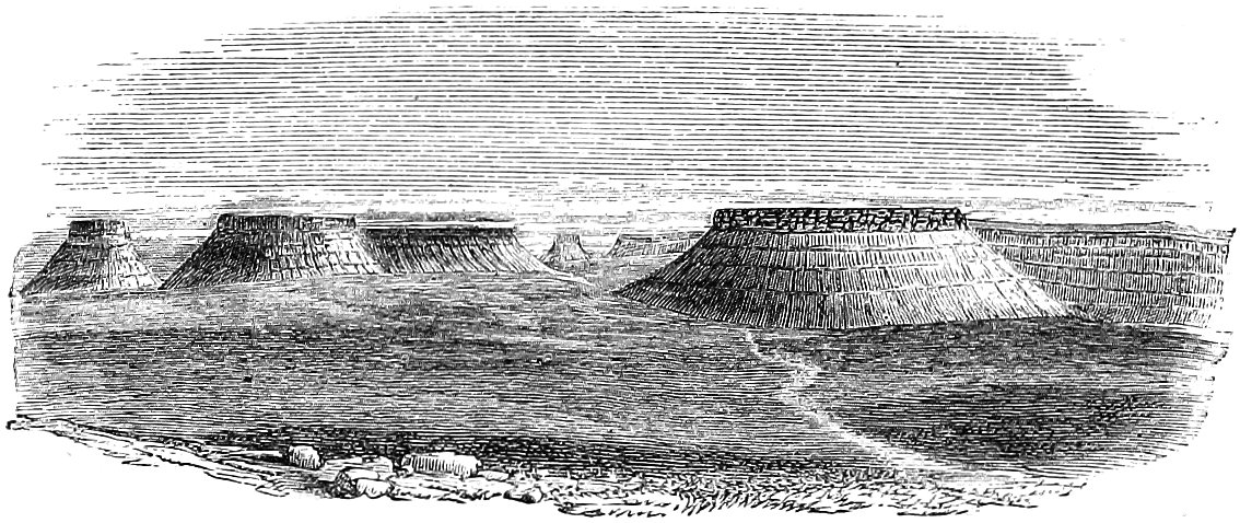 [486]‘One of the points we had determined to visit on our tour was the ruin known by the Moors as “Pharaoh’s Palace,” or “Pharaoh’s Tomb.” The time of our journey was in some respects unfortunate for visiting places held in veneration by the natives; we were, in fact, staying in Fez at the time of Mohammed’s birthday, when religious fanaticism exhibits itself, not merely in holidays and powder-play, alternating with devotional exercises, but in processions to the shrines of saints, and in sundry manifestations of ill-will to unbelievers. We had considerable difficulty in obtaining intelligible information as to the exact site of the ruins. Our idea had been that they ought to have been accessible from the road between Alcazar and Fez, striking off near Sidi Guiddar. The interpreter and the mounted soldiers who were with us, overruled this when it was proposed, and we therefore continued our journey. They were probably right; but in our various conversations with them on the subject they managed to convey the impression that either they did not themselves know the precise locality, or that they did not intend that we should visit the place.