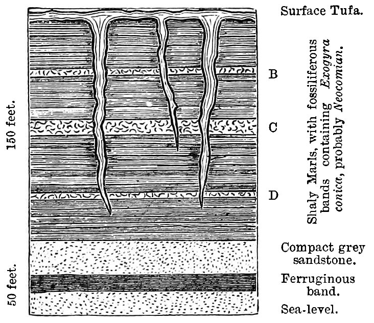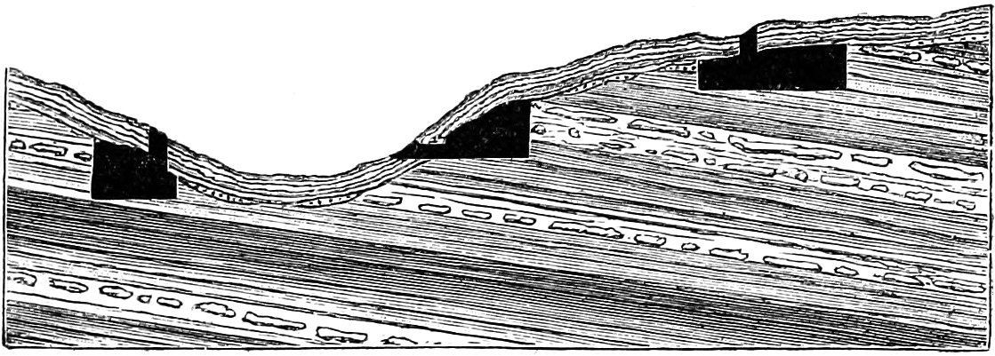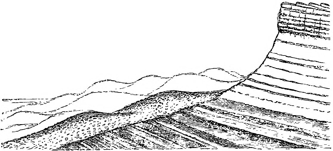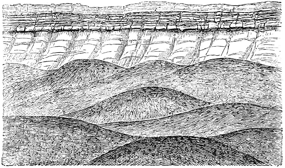 ‘We proposed to make the Roman station the first stage on our road from Mekinez to Rabat. Whether it would have been better to have taken it, as we had originally intended, on the way to Fez, or subsequently, between Fez and Mequinez, it is needless now to inquire; it certainly is a good deal out of the direct route between Mekinez and Rabat, if maps are to be trusted. However, we got on the way on March 23 a[487] little after 10 A.M. The site of the ruin is some fifteen miles north-west of Mekinez, at no great distance from Mouley Edris el Kebir; both are on the southern slopes of one of the ranges that constitute the Lesser Atlas. There was little of interest by the way. Part of the road was on the horizon of a bed of white, friable, microzoic, tertiary limestone, which forms a conspicuous feature in the mountain strata of this district. This is traceable for a great distance, and its exposure at one or two points in the heights to the far east, we had at first mistaken