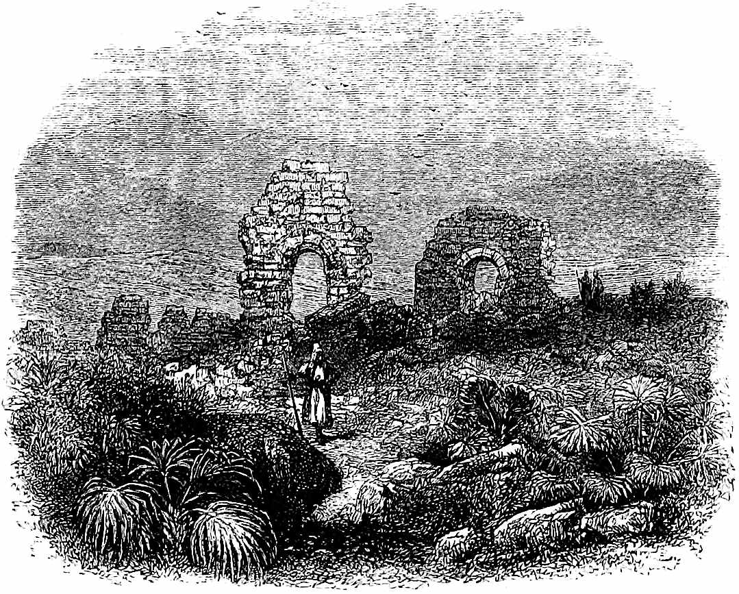 [488]‘The ruins stand on a little hill, a mile or more from the road. At the base of the hill runs a bright little mountain stream. The ground for many acres is strewed and heaped with squared stones, the débris of ancient buildings; lines of wall-foundations appear in every direction, and pillar bases in rows or squares, arranged as though for the support of colonnades surrounding courts or patios. The demolition is no doubt largely due to spoliation, but it is also partly the result of the unstable character of the mortar, which has to a great extent weathered out from between the stones. In some of the walls still standing the stones appear to retain their places by their own weight rather than by the help of any cement that is left to hold them together. Two perfect Roman arches still remain, and one or two nearly complete, but even these look as though they might not long withstand the mountain winds.’[1]