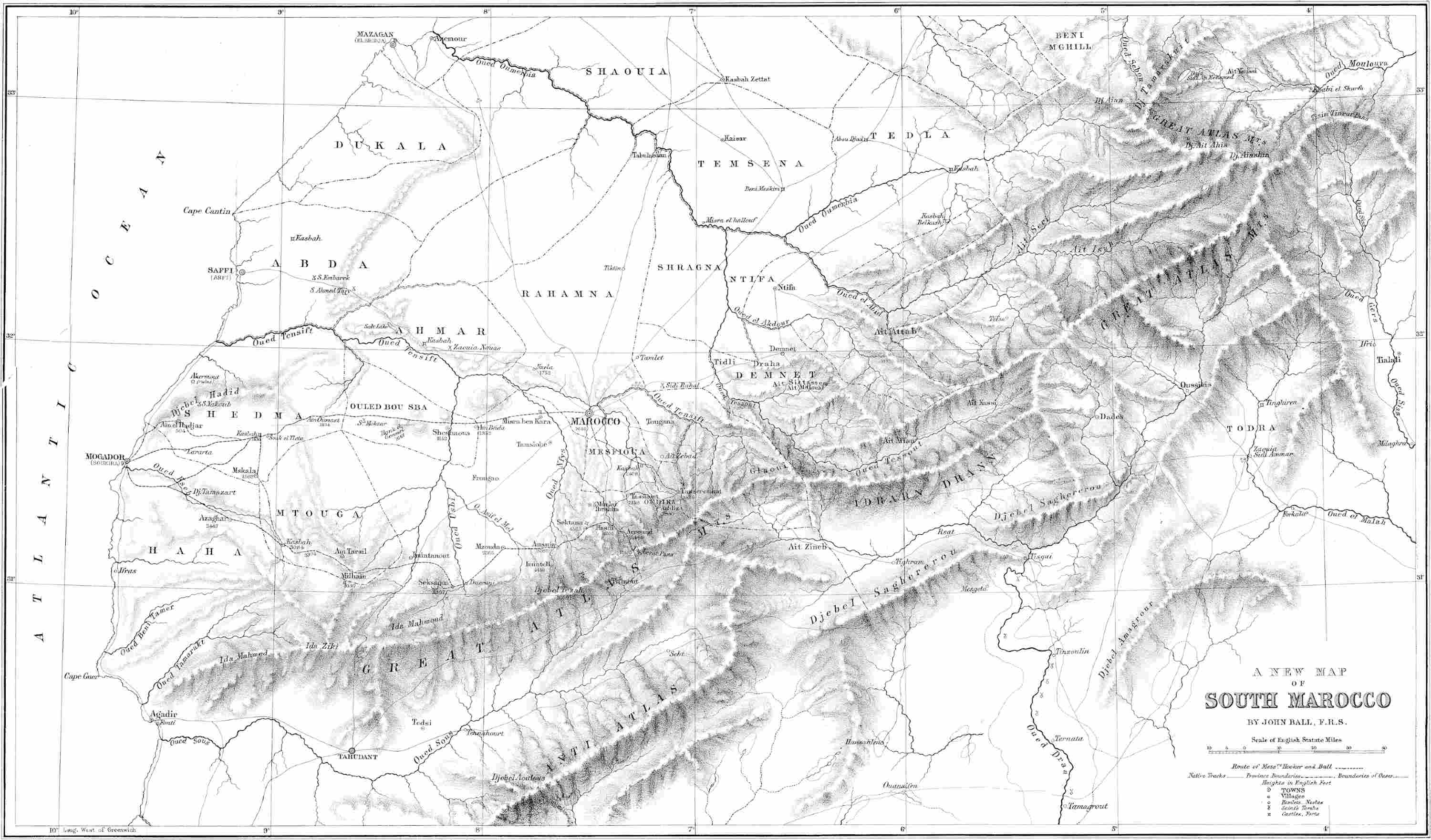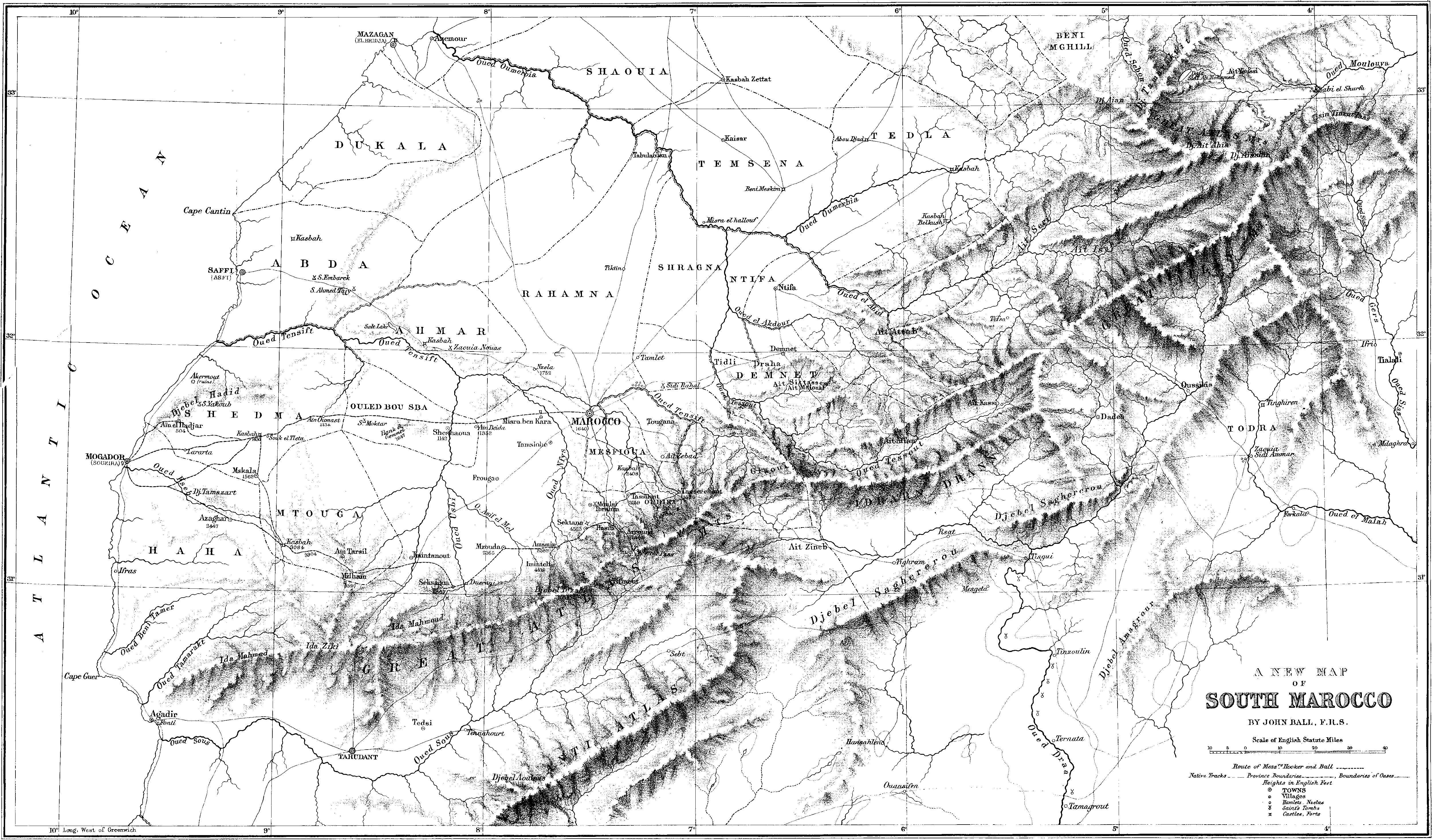 It is impossible to present these pages to the public without repeating the expression of our obligations to some of those to whose assistance we largely owe whatever success we were able to attain. Foremost amongst these we must name H. E. Sir John Drummond Hay, K.C.B., British Minister Plenipotentiary in Marocco. From the moment when, in compliance with the request of Sir J. Hooker, Lord Granville, then Foreign Secretary, instructed our Minister to apply for the permission of the Sultan to visit the Great Atlas, Sir J. D. Hay, by his extensive knowledge of the country and the people, and by his great personal influence, afforded invaluable assistance to the expedition.