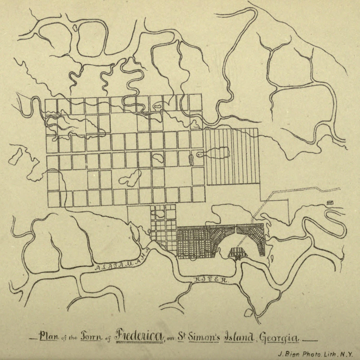 On the 5th of February, 1736, these ships, with the first of the flood, were carried over Tybee bar and found safe anchorage within. The emigrants were temporarily landed on Peeper island, where they dug a well and washed their clothes. It was Mr. Oglethorpe’s purpose to send most of these Saltzburgers to Frederica that they might assist in the development of that town and the construction of its fortifications. Desiring the benefit of their ministers, not wishing to divide their congregation, and being reluctant to go to the Southward where “they apprehended blows,”—fighting being “against their religion,”—they persuaded Mr. Oglethorpe to permit them to join their countrymen at Ebenezer, whither they accordingly went some days afterwards and were heartily welcomed. It will be remembered, however, that Captain Hermsdorf, with his little company, assured Mr. Oglethorpe “that he would never forsake him, but serve with the English to the last.” His offer was accepted, and on the 16th he set out with Mr. Oglethorpe for Frederica.