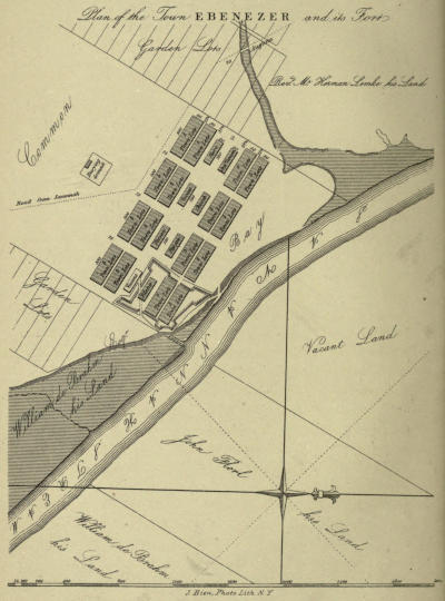 The plan adopted in laying out the town was prescribed by General Oglethorpe, and closely resembles that of Savannah;—the size of the lots and the width of the streets and lanes being in each case quite similar. To John Gerar, William DeBrahm, his Majesty’s Surveyor General for the Southern District of North America, who in 1757 erected a fort at Ebenezer, are we indebted for an accurate plan of that town.[13] As the village increased, this plan was extended;—its distinctive characteristics being retained. From contemporaneous notices we learn that New Ebenezer, within a short time after its settlement, gave manifest token of substantial growth and prosperity. The houses there erected were larger and more comfortable than those which had been built in the old town. Gardens and farms were cleared, enclosed, and brought under creditable cultivation, and the sedate, religious inhabitants enjoyed the fruits of their industry and economy.