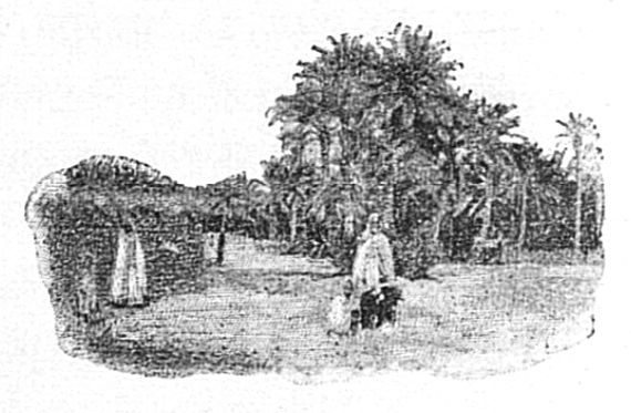 A l’instant ce personnage revêt son burnous le plus propre et il s’avance à notre rencontre suivi de quelques anciens de la tribu. Arrivé en notre présence, il nous touche la main droite qu’il porte ensuite à ses lèvres et à son cœur ; c’est la formule usuelle du salut. Il accompagne généralement cette politesse de quelques paroles emphatiques à la louange de ses hôtes ; il y joint volontiers des protestations de fidélité et manifeste le désir de recevoir les voyageurs dans sa propre maison. Il se montre très vexé d’apprendre que nous préférons passer la journée dans un jardin, en plein air, et que nous refusons absolument la diffa pour nous et pour notre suite.