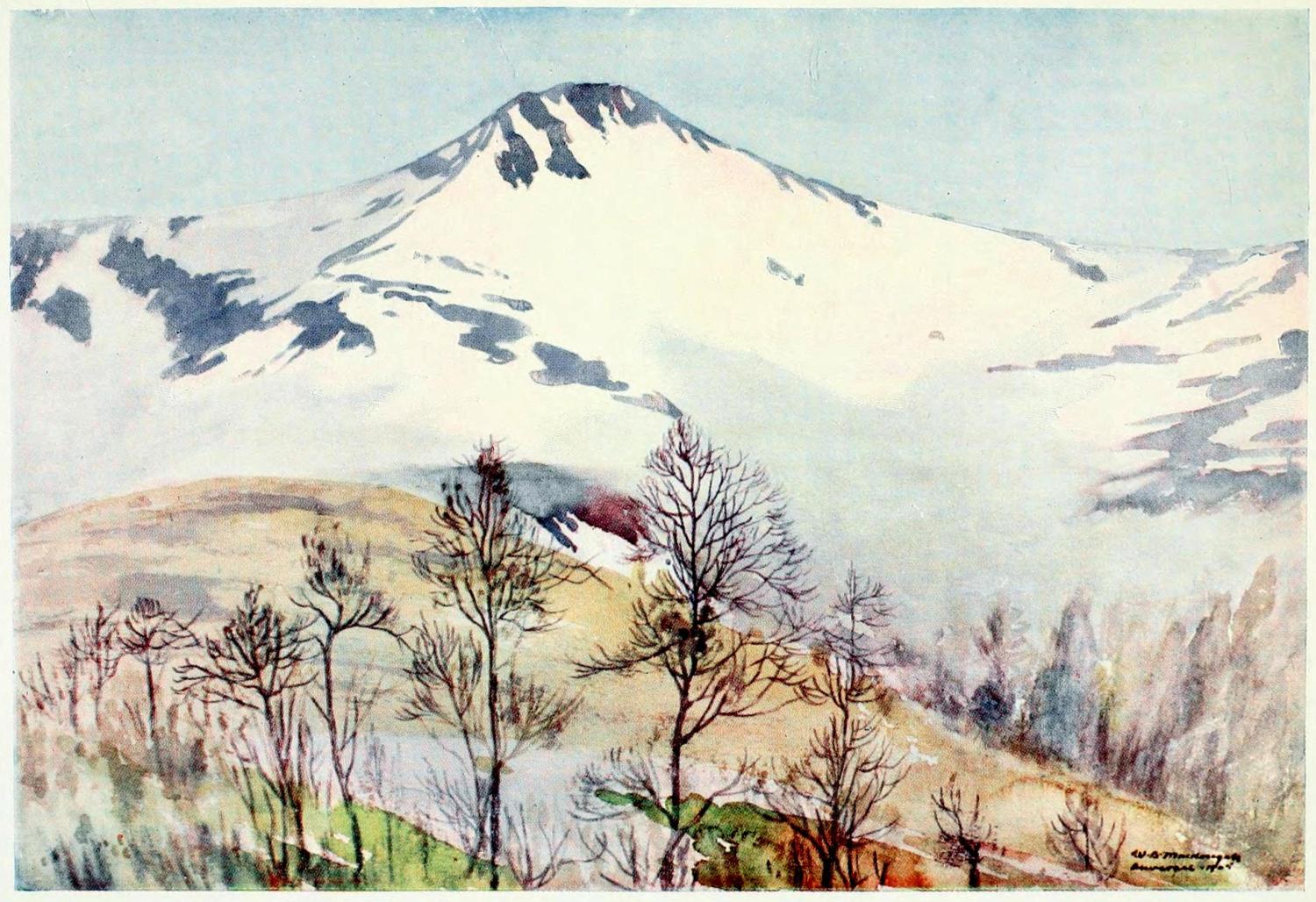 It is astonishing with what personality an accustomed eye invests a mountain. We say: “The Lioran is darker than usual this morning,” as we should say: “Emilia has a headache.” And what a pleasure when, towards September, the Courpou-Sauvage begins to blush with the blossoming heather! No mountains have ever seemed to me so friendly as these. They are not very high above our valley, which is situate some 2000 feet above sea-level, so that we behold a scant two-thirds of their real height. But their forms are lovely in their infinite variety. Time cannot wither them, nor custom stale. Woods cling to them; cliffs and rocks jut from them in peak or turret; cascades and fountains and innumerable streams gush from their hearts of fire; pasture, fern or heather robe them higher than the girdle; only the peaks are bare and take a thousand colours in the changing lights.