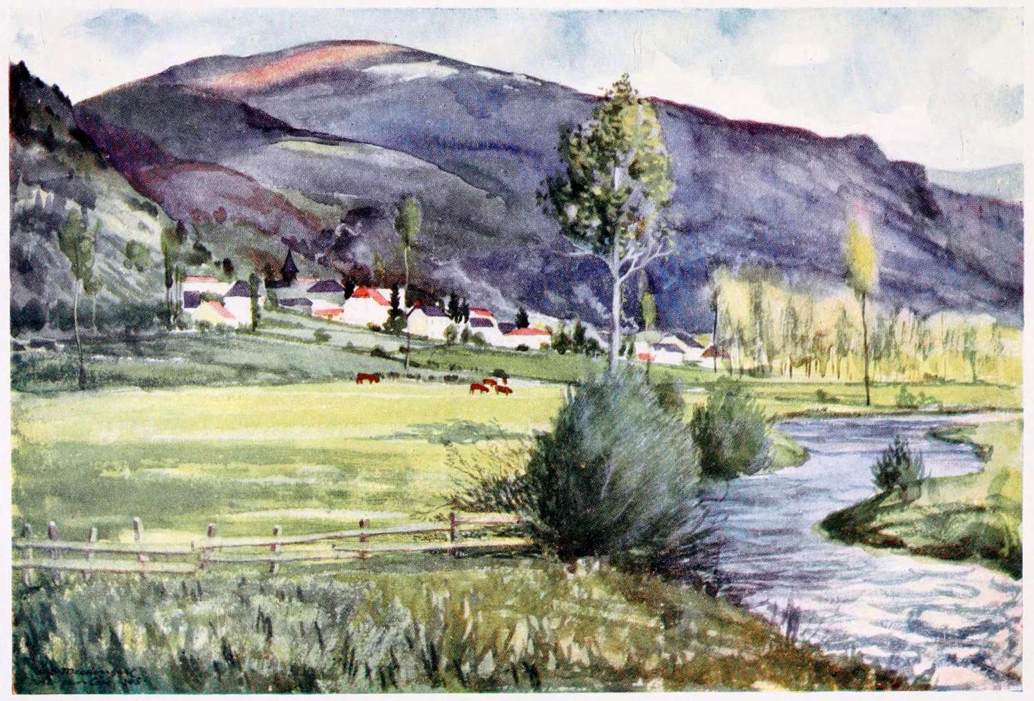 The hills do not rise sheer from the bottom, as in Switzerland. Innumerable landslips have torn their sides which, at periods of great distance, have fallen away from the cliff, heaping the ground with vast swellings and ridges, in much romantic confusion. Even to-day, these landslips continue, and the aspect of the country is slowly but continually transformed. Covered with beechwood or heather near the heights, green with pasture lower down, these ledges and terraces lead the eye to the valley bottom, which itself is never flat, but cradle-shaped. And therein lies the small winding river of the Cère.{6}