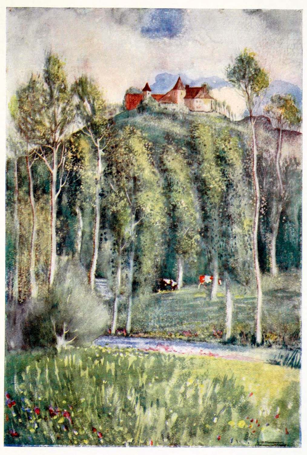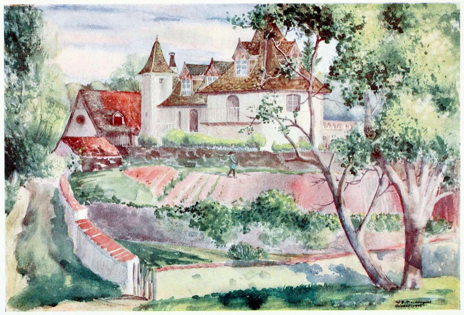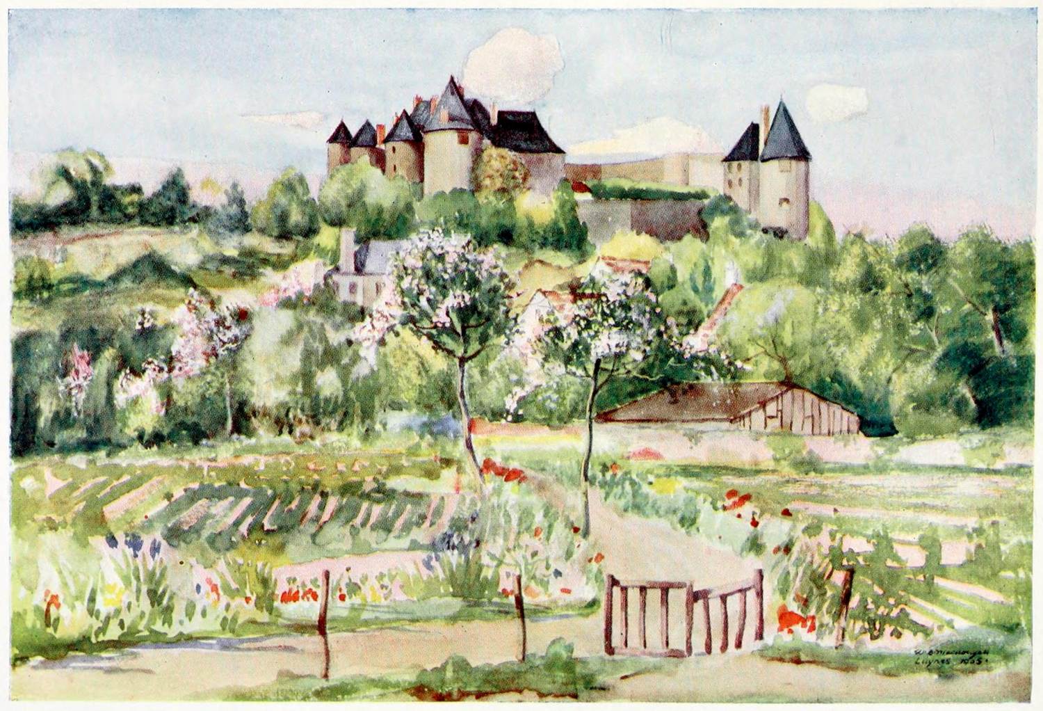 My husband’s old house of Olmet stands on one such ledge, some way up the southern bank of the valley, with the farm at its feet. Farm and house no longer belong to each other, but they are still on cordial terms; which is as well, since from our hinder terrace our eye drops involuntarily on all the life and business of our neighbours. The farm has been recently rebuilt by its new owner, and is no longer the picturesque hovel we used alternately to admire and deplore. But our tiny mountain manor, or moorland cottage, still bears the stamp of three hundred years on its thick solid walls and tower. The roof is beautiful, very steep, as befits a land of six months’ snow, and a soft ash-grey in colour, being covered with thick heart-shaped tiles of powdery mica-schist, which surmount with a pyramid either tiny solid turret: a balcony starts out from the tower, whence you could sling a stone into the bottom of the valley, for Olmet stands on a jutting rock, to the great advantage of our view. The house is stunted from the front, where the garden is on the level of the first floor; but, seen from below, there is about the place a look at once austere and peaceful, rustic and dignified, as befits this land of hay and lava, of mountain peak and cream.