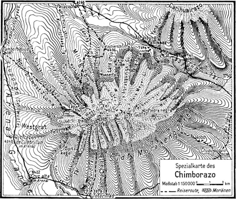 Die Reise in die Hochanden Ecuadors ist der Schlußstein dieser Untersuchungen Hans Meyers gewesen. Sie führte ihn und seinen Begleiter, den Münchner Landschaftsmaler und Alpinisten Rudolf Reschreiter, im Jahr 1903 über die Landenge von Panama nach dem Hafen von Ecuador, Guayaquil, dann auf das Hochland nach Riobamba hinauf zunächst in die Westkordillere auf den Chimborazo und an den Carihuairazo, die über der Mulde von Riobamba thronen, weiter hinüber zur Ostkordillere auf den Cerro Altar, fernerhin im interandinen Längstal nach Latacunga und von da auf[10] den Cotopaxi und an den abseits stehenden, schwer zugänglichen Quilindaña; dann längs der Hochlandstraße an den Vulkanen des mittleren Ecuador, dem Iliniza, Corazon und Rumiñagui, vorbei nach der Landeshauptstadt Quito; von Quito quer über die interandine Mulde zum Antisana auf der Ostkordillere und wieder zurück zur Hauptstadt. Danach ging es denselben Weg nach Riobamba zurück, nochmals zum Chimborazo hinauf, und hiernach mit der Bahn wieder hinab nach Guayaquil; endlich über Panama nach New York und heimwärts nach Deutschland.