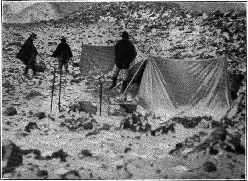 Wir blieben auf dem »Arenal« bis zur Höhe von 4576 Meter, wo das erste Neuschneefeld begann und die hohe Stirn eines ältern Lavastroms ein kleines, ziemlich ebenes Aschenfeld halb umschließt. Hier an den Felsen, bergwärts einigermaßen geschützt gegen den scharfen Wind, wurden die beiden Zeltchen aufgestellt und mit schweren Steinen ringsum verankert. Kochwasser lieferte uns der Schnee, Trinkwasser hatten wir in einem Fäßchen mitgebracht, und Feuerholz hatten wir von den letzten verwetterten Chuquiraguasträuchern mitgenommen. In unserer Zeltumgebung wuchs nichts mehr als ein versprengtes Exemplar von Senecio microdon, ein zwerghaftes, pelzhaariges Polsterchen, und eine einzige Hypochaeris sessiliflora, eine kaum 2 Zentimeter hohe kleine Rosette.