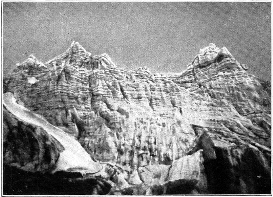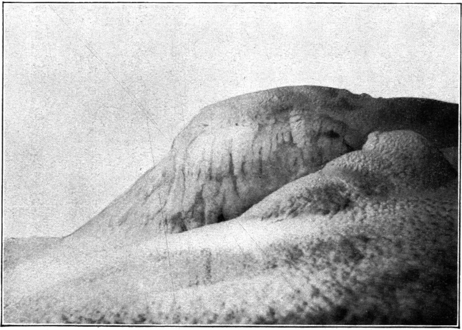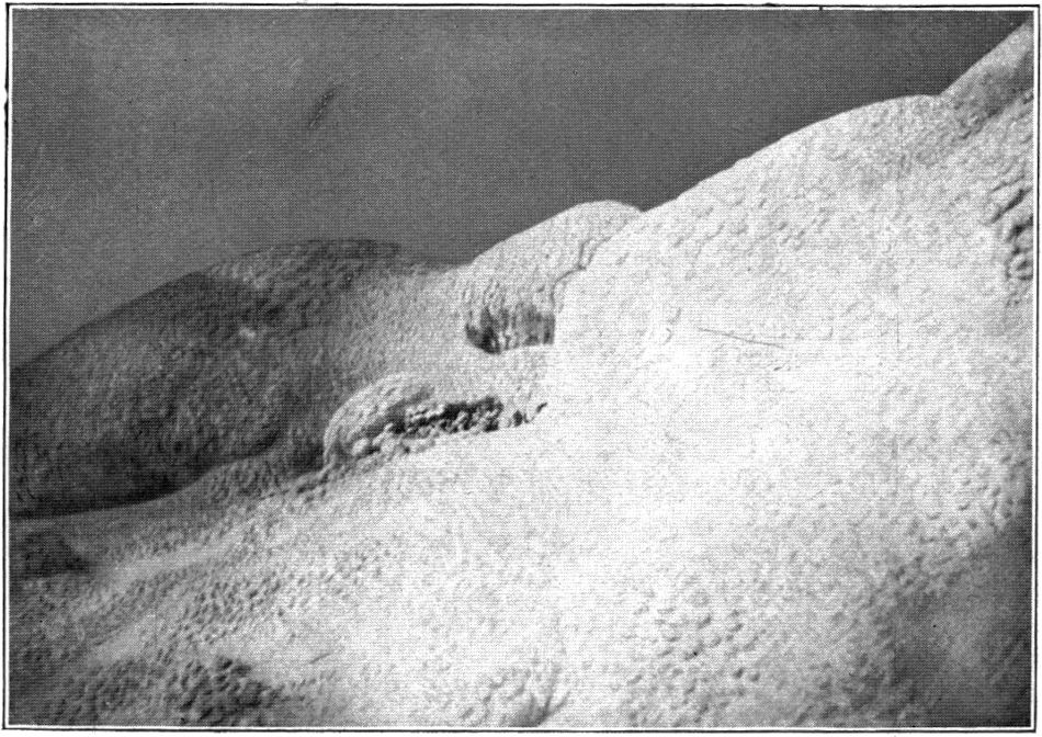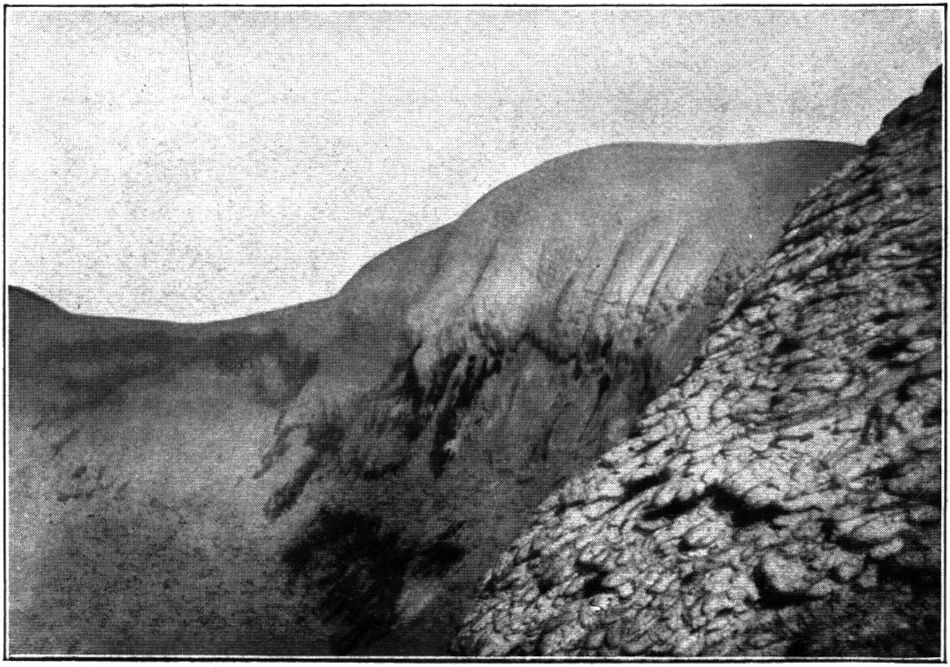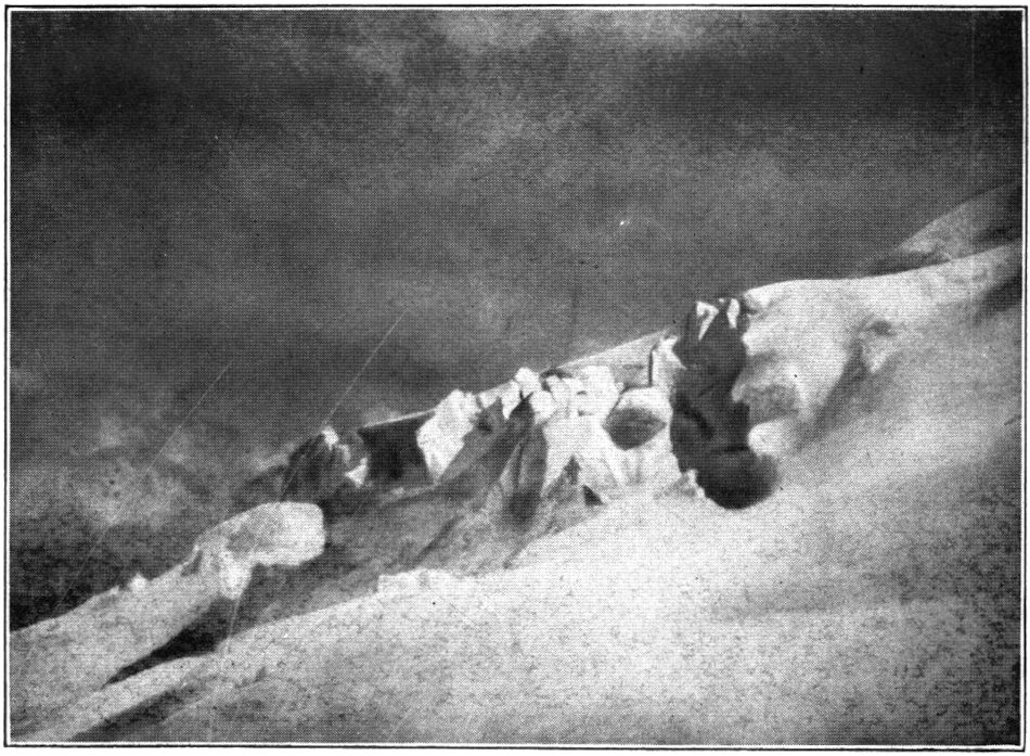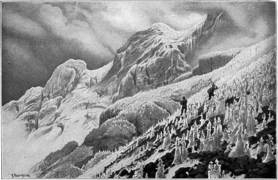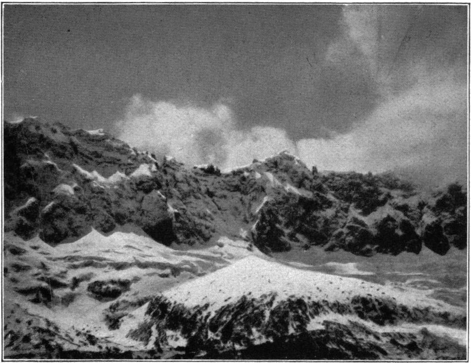 So kamen wir in kurzem in die oberste Region, wo die Steilhänge in große Firnstufen und diese in lange Rücken und Hügelreihen übergehen, lauter Schnee und Eis von sonderbaren, blumenkohlartigen Oberflächenformen, die immer phantastischer wurden, je mehr wir uns dem Gipfelkrater näherten. Die Stufenbildung des Firns ist zweifellos durch darunterliegende Lavawülste und Lavatreppen verursacht, die von den Magmaergüssen des Kraters hier oben am Rande erkaltet hängengeblieben sind, während die Hauptmassen hinabgerutscht sind.