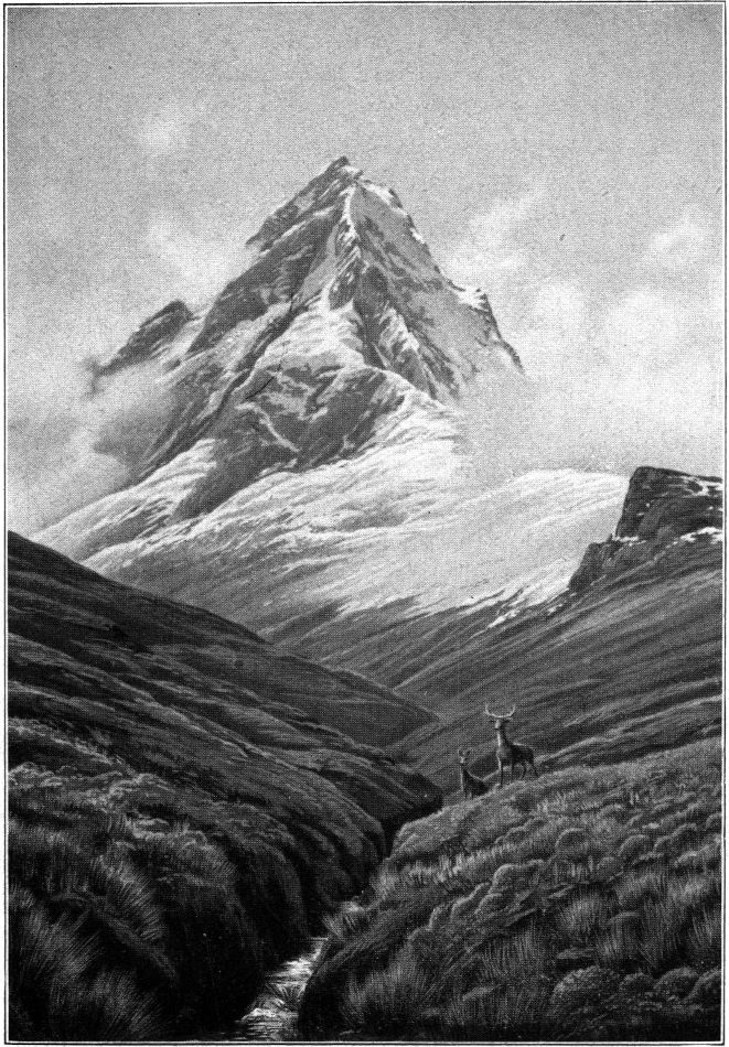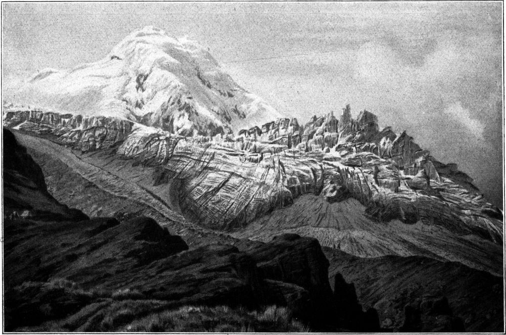Sobald man aber nach der Nordseite des Berges umgebogen[27] ist, ändert sich das Bild total. Der Berg breitet seine vielgliedrige Längsansicht vor uns aus, und jetzt sehen wir über dunklen Schuttmassen und Felswänden die fünf runden Firngipfel auf dem langen Schneerücken thronen. Die Nähe des benachbarten vereisten Carihuairazo stört freilich die Einheitlichkeit des Bergbildes; dagegen erhöht sie mächtig den Gesamteindruck der großen alpinen Landschaft. Sie packt und fesselt uns um so mehr, als die Vergletscherung des Chimborazo auf keiner andern Seite des Berges so großartig ist wie auf den dem Carihuairazo zugewandten Flanken.