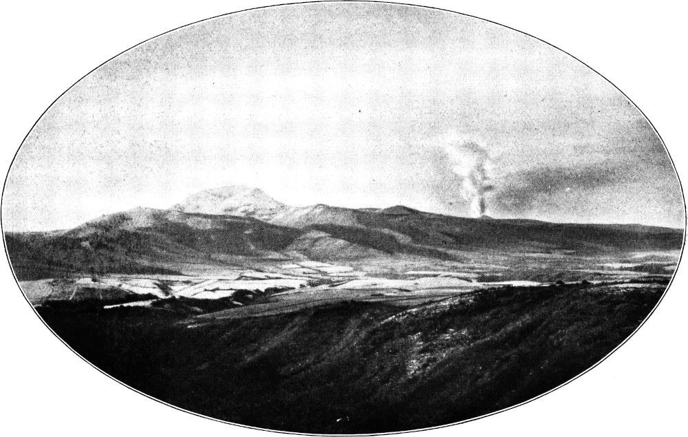 Da das Wetter meist klar war, hatten wir nach Osten einen schier unermeßlichen Überblick über die weite, nach Riobamba hinabsinkende Hochmulde bis an die ferne Ostkordillere, über deren blaudunstige Kette die Schneespitzen des Cerro Altar herüberleuchteten. Weiter südlich quoll plötzlich hinter der Ostkordillere eine ungeheuere, teils blaugraue, teils kupferbraune Wolkenmasse empor, die Ausbruchswolke des von hier unsichtbaren Sangayvulkans, den man gleichzeitig dumpf donnern hört. Sie streckt und breitet und rundet sich wie eine kolossale Lokomotivrauchwolke, steigt in ihren obersten Wölbungen bis zu 10 000 und 11 000 Meter in die Höhe und wird dort oben von einer nordöstlichen Luftströmung in langem Zug nach Südwesten geweht, wobei sie ihre Asche in graubraunen Schwaden und Schleiern gleich dem schief streichenden Regen einer fernen Gewitterwolke über das Land ausstreut.