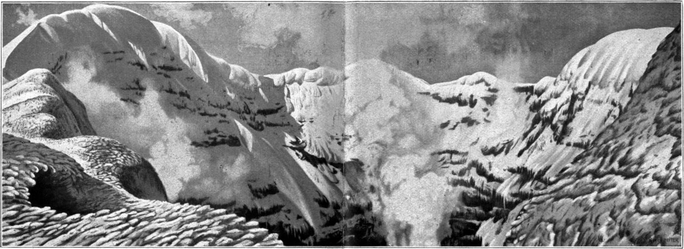 Noch eine Viertelstunde lavierten wir mit äußerster, nach Pausen der Ermattung immer wiederholter Konzentration von Kraft und Willen durch die wie riesige Wogen immer wieder vor uns aufsteigenden Firnhügel. Aber die[152] Oberfläche war fest und ließ den Fuß sicher auftreten. Herr Reschreiter war ein Stück voraus, ich zurück beim Photographieren der wundersamen Firngebilde, die hier die Form von weißen Korallenbänken hatten. Da höre ich unfern über mir seinen Ruf: »Der Krater ist da!« und bin in einigen Minuten bei ihm.