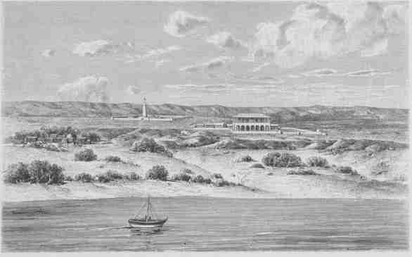 En promenant ma lorgnette sur la côte, je distingue la tour Soleillet, quelques arbres noueux, une dépression verdie par de chétifs palétuviers, le lit d'un torrent desséché, la maison de la Compagnie concessionnaire des dépôts de charbon, un hôpital inachevé et, à quelques milles de là, un amoncellement de houille exposé au grand air.