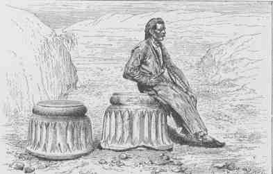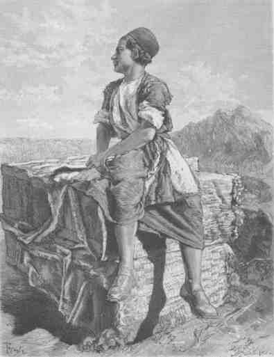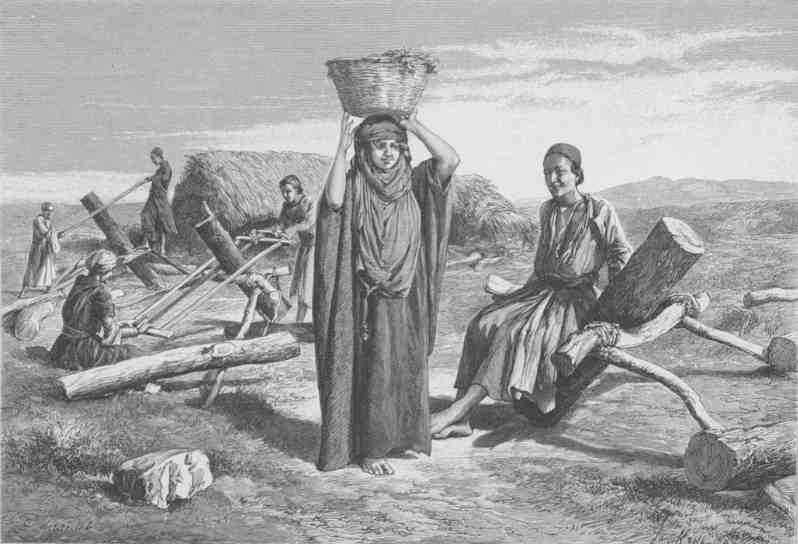 Encore un espace rocheux, puis apparaît un grand hôpital, construit avec les matériaux arrachés à la falaise. A droite poussent des buissons, plus bas et plus touffus que les tamaris venus sous l'œil protecteur du gouverneur. La plus haute branche de chacun d'eux est couronnée d'un vieux vase. Cette potiche ainsi placée indique que l'arbre est habité. Sous les rameaux de l'une de ces maisons primitives, j'aperçois deux jeunes filles sommairement vêtues: la plus jeune écrase du blé en promenant sur une pierre dure un cylindre de porphyre aminci à ses extrémités; l'autre regarde travailler son amie.