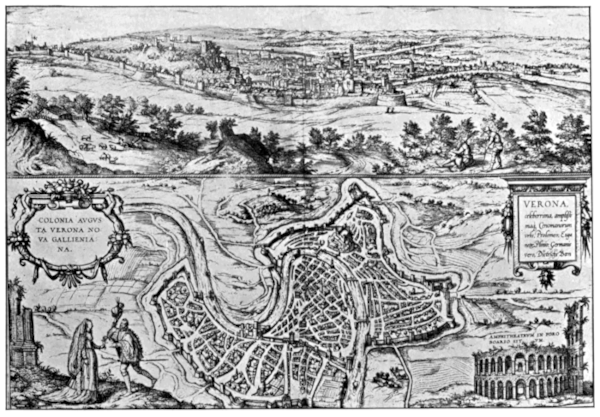 Verona is about the size of Poitiers, having a vast quay beside the Adisse, which flows through it and is crossed by three bridges. I went thither also with the baggage. Without the bulletins of health, which had been issued at Trante and confirmed at Rovere, our party would not have been admitted within the town; not that there was any talk of danger of the plague, but this is always done by custom or by way of tricking wayfarers out of a few coins. We went to the cathedral, where M. de Montaigne[Pg 2] remarked on the strange behaviour of those present at High Mass on such a solemn day. They chattered in the very choir of the church, standing with their hats on, and turning their backs to the altar, and recking naught of the office except at the time of elevation. There were an organ and violins, which gave musical accompaniment to the mass. We visited other churches, but saw nothing noteworthy, either in the ornaments or in the beauty of the women present. Amongst others we went to the church of Saint George, where the Germans have left divers marks of their presence and several coats-of-arms, together with an inscription relating how certain German noblemen in the train of the Emperor Maximilian, what time he came to take Verona from the Venetians, placed a certain piece of work over one of the altars. M. de Montaigne remarked that the government here preserved the memory of its reverses, as it also preserved in their integrity the beautiful tombs of the ill-starred Scaligers. It is a fact that our host of the “Chevalet,” an excellent house, where we found a superfluity of good fare and a bill one-fourth more than we would have paid in France, enjoyed the privilege of burying his family in one of the tombs aforesaid. We also visited, under the guidance of the castellan’s lieutenant, the castle where the government keeps on foot sixty soldiers; more, as M. de Montaigne was informed, as a safeguard against the townsfolk than against foreign foes; and then went to a religious house occupied by Jesuates de Saint Jerosme. These are not priests, neither do they say mass or preach, being for the most part ignorant, but they are skilful distillers of citron and other sorts of water, both here and in other places. They wear white frocks, small white caps, and over this a cloak of dark russet, and are very fine young men. Their church is excellently appointed, as is also their refectory, in which supper was already laid.