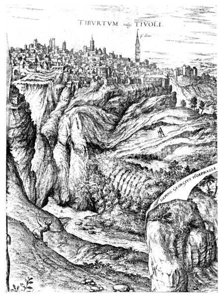 On April 3rd I left Rome early in the morning by the Porta San Lorenzo, Tiburtina. The road I took was fairly level, and ran through a country which was for the most part fertile cornland and sparsely populated, like all the approaches to Rome. I crossed the Teverone, anciently the Anio, first at the bridge of Mammolo, and second by that of Lucan, the old name of this bridge being still retained. On this bridge are divers ancient inscriptions, and the chief of these is still easily legible; moreover, two or three Roman tombs are yet standing along this road. Few other antiquities are to be seen, and on the Via Tiburtina itself only a very little of the ancient pavement in great blocks. After a journey of fifteen miles, I arrived in time for dinner at Tivoli, the ancient Tiburtum.
