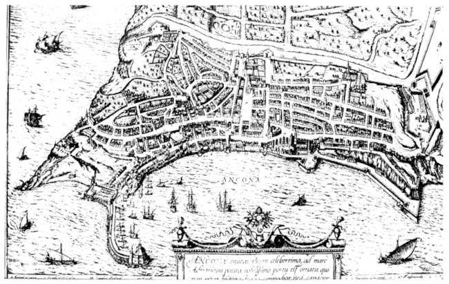 On the Wednesday after dinner I travelled through a fertile open country of a varied character, and after a journey of fifteen miles I arrived at Ancona in time for supper. Ancona is the capital of the Marches, which district was called by the Latins Picænum. The city is populous, swarming especially with Greeks, Turks, and Sclavonians, and a busy place of traffic. It is well built, flanked on either side by lofty hills, which project into the sea, one of these being occupied by a strong fort, by which we entered, and the[Pg 2] other by a church. Between these heights and the slopes thereof the town is built, the main part being placed in the bottom of the valley and along by the sea, where there is a very fine port, and near thereto a magnificent arch built in honour of the Emperor Trajan, his wife, and his sister. The sea passage over into Sclavonia is often made in eight, ten, or twelve hours, and I believe that for six crowns, or a little more, I might have hired a bark to take me to Venice. I paid thirty-three pistoles for the hire of eight horses as far as Lucca, eight days’ journey, the vetturino agreeing to feed the horses and to give me the use of the same for four or five days in addition, if necessary, provided I should pay the outlay on the horses and servants.