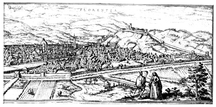 The inn here is indifferent: near by is a spring, a little above Ancisa in the Val d’Arno, which is celebrated by Petrarch; indeed, it is held by some that Ancisa was his birthplace. Certainly they claim this honour for a house some mile distant, of which now only a few paltry fragments remain: in any case they point out the place.28[Pg 25] Here they were planting melons amongst others which had been planted some time before, in the expectation of gathering the same in August. This morning I felt my head heavy and my sight troubled, these being symptoms of those headaches with which I have been affected for the last ten years. This valley was formerly a morass, and Livy relates how Hannibal was forced to ride an elephant when he traversed it, and lost one of his eyes on account of the severity of the season:29 it is assuredly a flat and low-lying country and greatly at the mercy of the floods of the Arno. I refused to eat at dinner, but I repented of this, for had I eaten I might have vomited, and I always find the speediest remedy thereby. Otherwise I am troubled by my head for a day or two, as was now the case. The road was crowded with country-folk taking provisions to Florence, where we arrived after crossing one of the four stone bridges over the Arno, having ridden twelve miles.