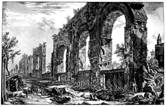 On the following morning I departed, and at the third milestone I turned to the left; and, having crossed the bridge over the Cardiana,13 a stream which joins the Metaurus, I went three miles through the mountains, over a narrow and difficult road, at the end of which we came upon a passage, fifty good paces in length, which had been fashioned through a high rock.14 On account of the magnitude of the work, Augustus, who had[Pg 12] first set his hand thereto, caused an inscription to be put up in his name. This, however, has perished by time; but another inscription in honour of Vespasian is still to be seen at the other end of the pass. Everywhere round about are remains of vast constructions of great height for the conveyance of water, and below the road rocks of enormous thickness have been cut through or levelled. All along this road, the Via Flaminia, which leads to Rome, are traces of the great stones used for paving, but most of these are buried; and the road, which was originally forty feet wide, is now not more than four. I went out of my way to visit this spot, and then retraced my steps to get once more on my road, which took me at the foot of a range of fertile, gently sloping hills. Towards the end of our journey the road ran now up and now down hill, and at the end of sixteen miles we found ourselves at Urbino.