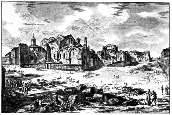 On Sunday, October the 8th, I went to the baths of Diocletian on Monte Cavallo to see the performances of an Italian who, during a long captivity amongst the Turks, had learnt some wonderful feats of horsemanship: for instance, while the horse was going at full speed, he would stand upright on the saddle and hurl a dart with all his force, and at the same moment drop down into his seat. Again, in full course he would get off the horse, grasping the saddle-bow with one hand, touching the ground with his right foot and keeping the left in the stirrup. He mounted and dismounted several times in this fashion, and turned[Pg 168] somersaults on the saddle while the horse was going full speed, and shot arrows from a Turkish bow in front and in the rear with the utmost rapidity. He next rode the horse standing upright on his feet, and bending his body downwards so that his head and shoulders rested on the horse’s neck, and then he took a club in hand and, having thrown it off into the air, caught it again during his course. Standing on the saddle he took a lance, with which he struck a glove and transfixed it as if he were running at the ring. On foot he caused a staff to revolve in a circle round his neck, having first set the same going with his hand.108