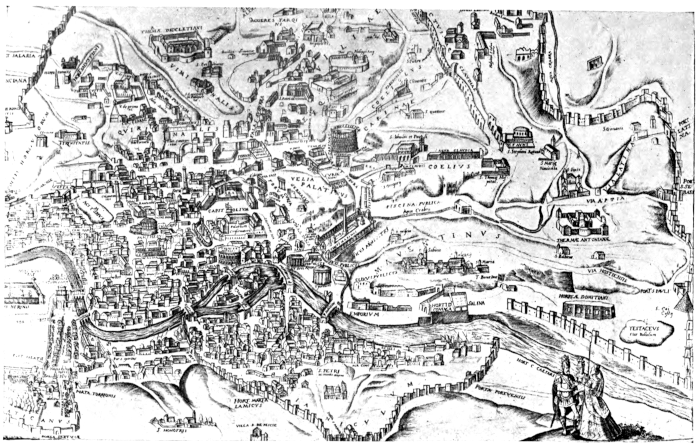 Fossombrone,10 fifteen miles distant from Fano, and belonging to the Duke of Urbino, stands at the entrance to the mountains, which close up towards each other at the end of the flat country. The town stands close to the mountain slopes, and in its lower parts possesses one or two fine straight streets, uniform and well built. Nevertheless, report says, the people are much poorer than those of Fano. In the public place is a large marble pedestal with a long inscription of the age of Trajan, written in honour of a certain inhabitant of[Pg 10] the place;11 and set against the wall is another without any sign to proclaim its date. This place was formerly called Forum Sempronii, and the people now maintain that the original town stood farther towards the plain, and that ruins of the same are still to be found on a vastly better site. Here is a stone bridge which carries the Via Flaminia over the Metaurus. Seeing that I arrived in good time—for the miles are short ones, and we are seldom in the saddle more than seven or eight hours—I had plenty of time to talk with the good folk of the place, and to glean from them information concerning their town and its surroundings. We visited a garden belonging to the cardinal of Urbino,12 in which[Pg 11] were many vines grafted upon other stocks, and I had some talk with one Vincentius Castellani, a worthy man of letters and a citizen of the place.