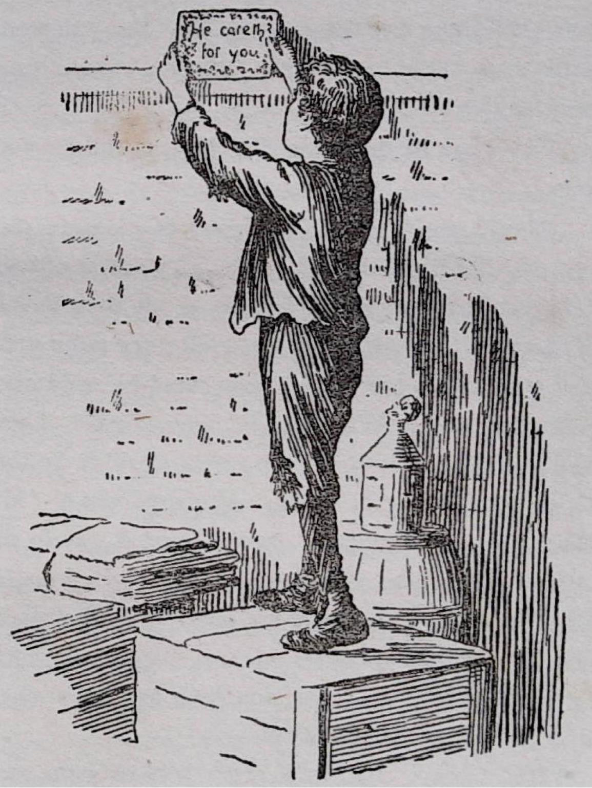 Jasper smiled. "My old eyes won't hurry themselves," he said. "I can't see yet. We must have more light, I reckon; put a match to the lamp, Rob, and hand down my glasses. Now then, we'll have a look. What's it all about, eh? 'He careth for you.' Humph! It's very pretty to look at; but I don't see much meaning in it."