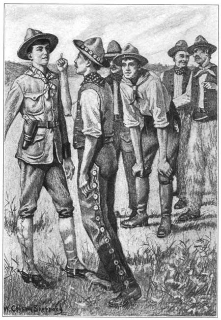 It was a big, husky-looking chap who uttered this rapid flow of words, and the shout which ended his sentence rang through the spacious square room of the ranch-house so lustily that his hearers, a crowd of six boys and two men, broke into a storm of laughter.