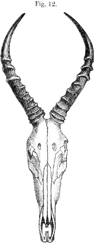 Skull and horns as described above (p. 213). Dimensions of an adult male skull: basal length 6·5 inches, greatest breadth 3·2, muzzle to orbit 3·65.