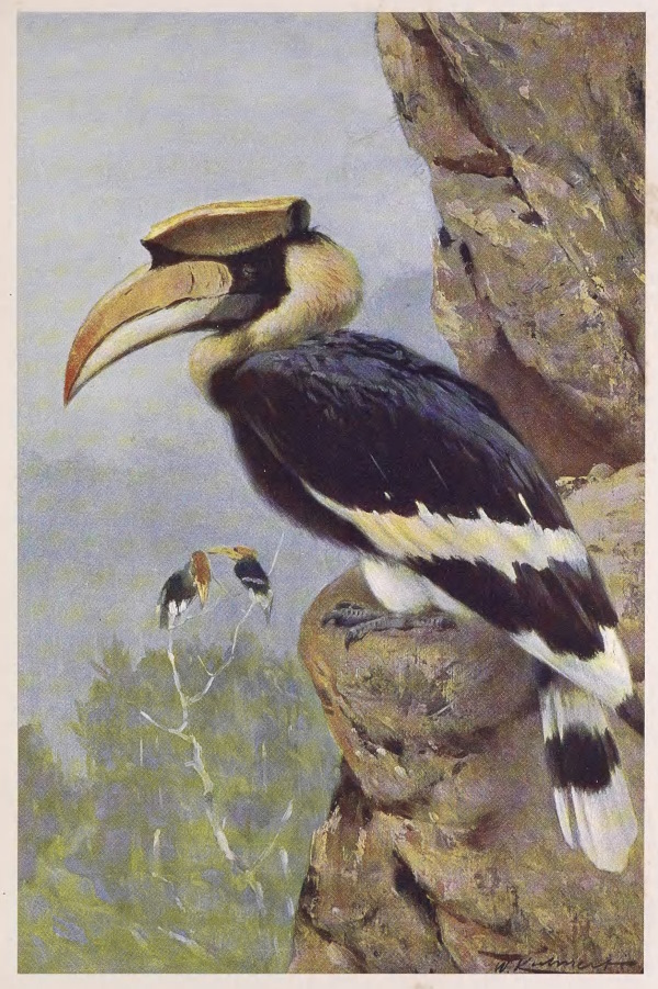 The pied, or double-horned species, the hornray of the natives, inhabits the dense forests of the Indo-Malay countries from the Himalaya and the Indian peninsula to the south of China and Sumatra. The glossy plumage is mostly black above, with the under-parts, the neck, the tips of the flight feathers, and the tail feathers more or less white or whitish, the upper half of the huge beak, with its horn-like appendage, being reddish yellow, and the lower half yellow. The total length of the bird, which is the largest member of the whole group, exceeds a yard. The so-called “horn,” or casque, forms a more or less flat and oblong platform on the upper part of the beak and the fore part of the head, terminating in front in two obtuse corners. On the other hand, the same appendage in the nearly allied rhinoceros-hornbill, or engan (Buceros rhinoceros), is much more horn-like, as it turns up into a recurved point in front.