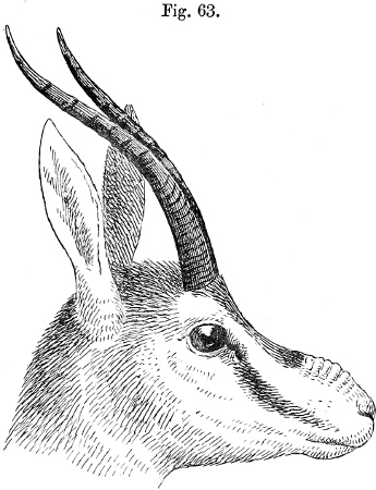 [3] This species may be taken as the type of Gazella, as being the only one which is common to Lichtenstein’s original genus and to Blainville’s “Gazella” of 1816. The latter author is ordinarily quoted as the original founder of the name, and his list includes the best known species—G. dorcas. But Lichtenstein’s genus, two years earlier in date, does not contain G. dorcas at all, and the only way in which the name Gazella can be properly retained for this group is by regarding G. subgutturosa as its type.