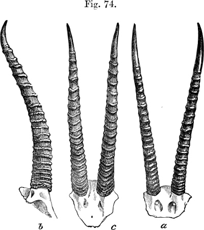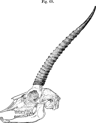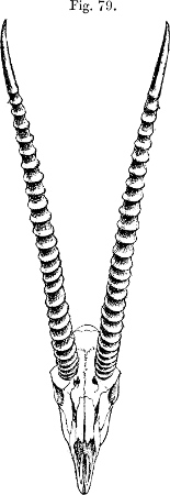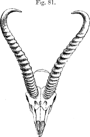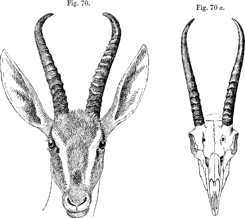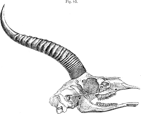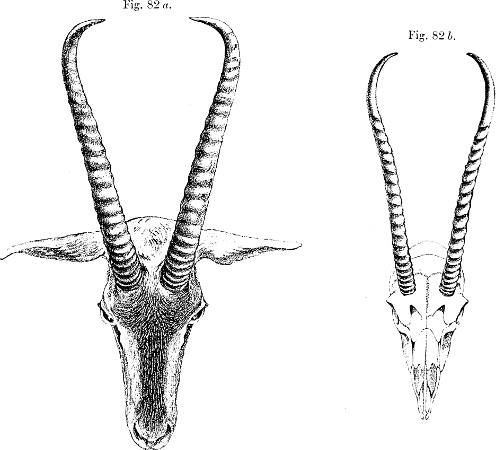 In his description Brooke pointed out that, as is well shown in the accompanying figure (p. 231), which has been copied from the plate that illustrates his paper, the skull of this Gazelle, besides its general depression, stands widely apart from those of all other species of the group in the enormous backward prolongation of the occiput—“an extension gained principally by the great size of the occipital bone and the prominence of the occipital crest.”[231] This divergence was so remarkable that Brooke doubted “whether the species should not constitute the type of a new subgenus.” As we shall see later, Brooke’s views have been fully justified by what has taken place since a close acquaintance with the structure of this singular Antelope has been acquired.
