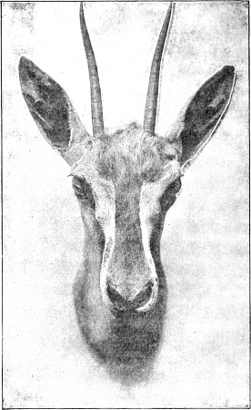 “The long neck of the Gerenúk, the large giraffe-like eyes, and long muzzle are peculiar to it and the Dibatag (Ammodorcas clarkei). The Gerenúk is more of a browser of bushes than a grass-feeder, and I have twice shot it in the act of standing[233] on the hind legs, neck extended, and fore feet against the trunk of a tree, reaching down the tender shoots, which could not be got in any other way. Thus not only the appearance, but the habits of the Gerenúk are giraffe-like. The skull extends far back behind the ears, like that of a camel.