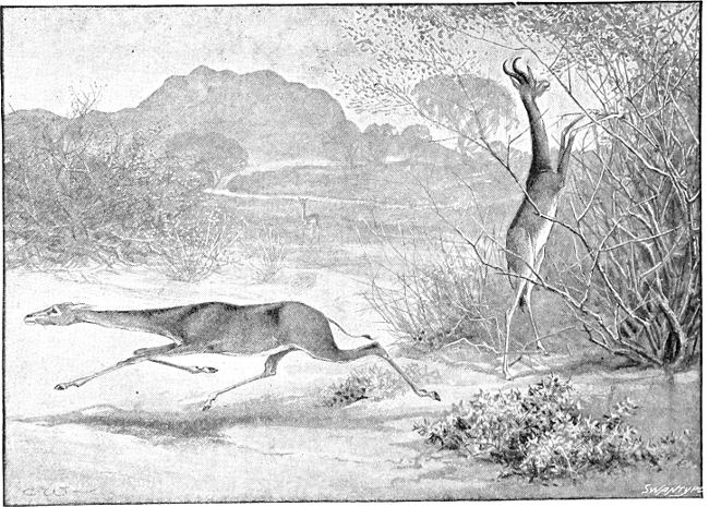 “The Gerenúk is the commonest and most widely distributed of the Somáli Antelopes except the little Sakáro, which springs up like a hare from every thicket.