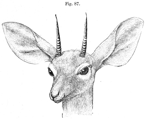 Early in 1894 the much-wished-for skins were obtained by the faithful Somalis and forwarded to Sclater by Captain Swayne. We were proceeding to describe and figure them in the Zoological Society’s ‘Proceedings,’ when we found that we had been anticipated by Herr Menges, who had just[243] described the species in the ‘Zoologischer Anzeiger,’ and given it the name “Oreotragus megalotis.” It has, however, certainly but a very remote connection, except as regards its habits, with the Klipspringer (Oreotragus), and Dr. Noack was quite justified in proposing for it the new and appropriate term Dorcatragus (δορκας, an Antelope, and τραγος, a Goat), which he did in the same periodical shortly afterwards. Dr. Noack based his article upon two specimens, male and female, which he had then lately received from Herr Menges for examination.