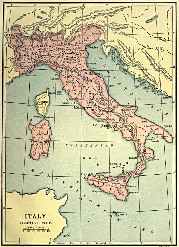 | The kingdom of Naples, 231. Joanna II, 234. Alfonso the Magnanimous, 237. Ferdinand, 238. The tyrants of Lombardy, 240. Companies of adventure, 241. Florence menaced by the Visconti, 243. Charles IV in Italy, 244. The “war of Liberation,” 248. The papal schism, 249. Gian Galeazzo Visconti, 251. Filippo Maria Visconti, 257. The house of Sforza, 258. | |