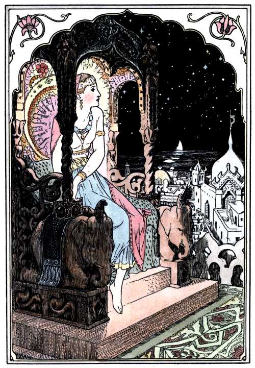 When it was quite black night the princess got up. She dressed herself in her rich clothes and jewels, and rolled up her hair, and across her head she put a band of diamonds and pearls. Then she shone like the moon, and her beauty made night day. She came out of her room, and sat on the roof of her palace. In the daytime she never came out of her house; she only came out at night. All the people in her father's country then went about their work and finished it.[10]